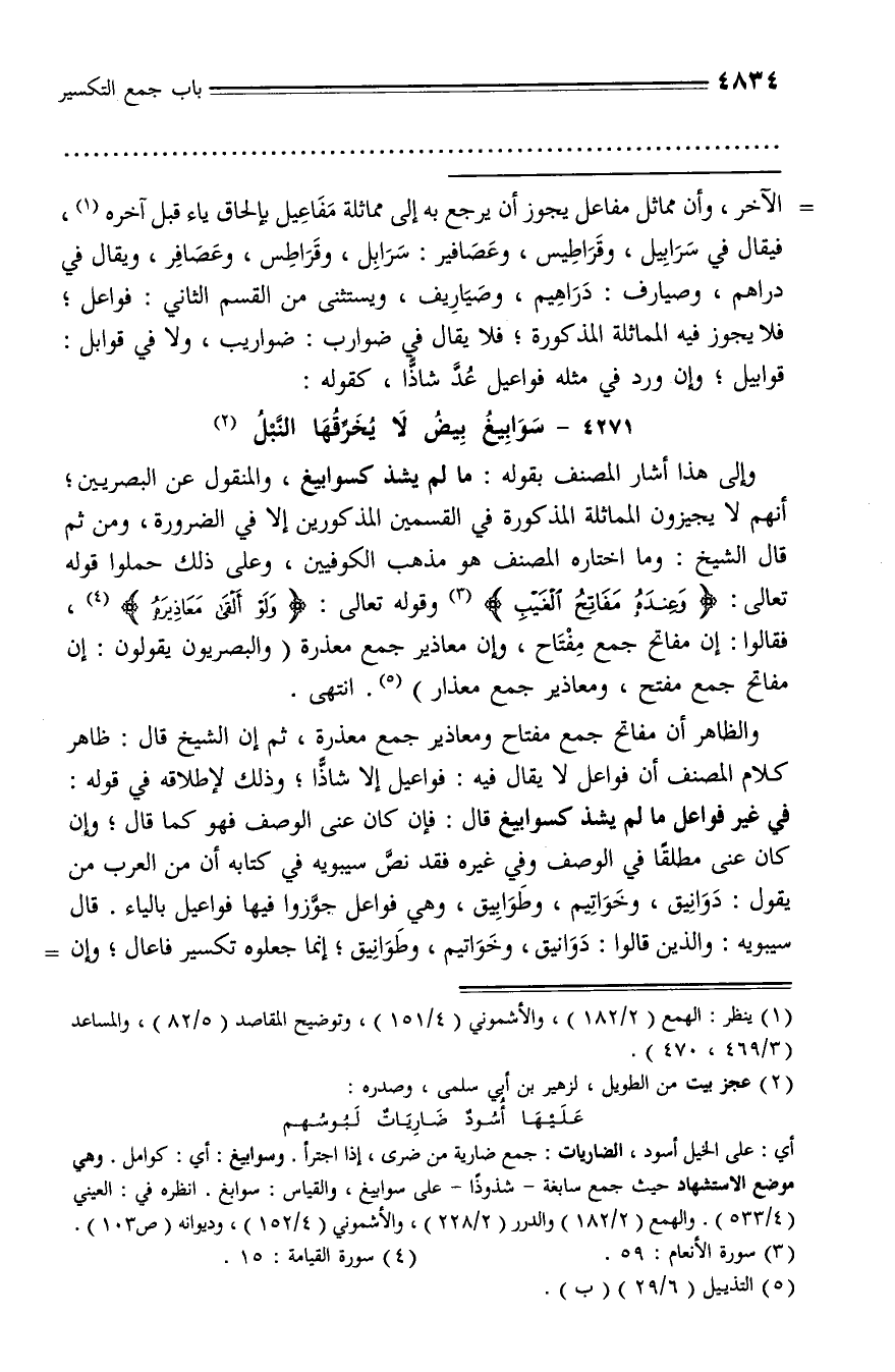 وإلى هذا أشار المصنف بقوله: ما لم يشذ كسوابيغ، والمنقول عن البصريين؛ أنهم لا يجيزون المماثلة المذكورة في القسمين المذكورين إلا في الضرورة، ومن ثم قال الشيخ: وما اختاره المصنف هو مذهب الكوفيين، وعلى ذلك حملوا قوله تعالى: وَعِنْدَهُ مَفاتِحُ الْغَيْبِ (¬3) وقوله تعالى: وَلَوْ أَلْقى مَعاذِيرَهُ (¬4)، فقالوا: إن مفاتح جمع مفتاح، وإن معاذير جمع معذرة (والبصريون يقولون: إن مفاتح جمع مفتح، ومعاذير جمع معذار) (¬5). انتهى.