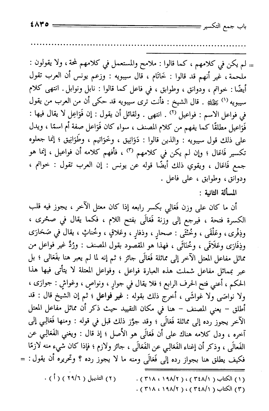 فواعيل مطلقا كما يفهم من كلام المصنف، سواء كان فواعل صفة أم اسما، ويدل على ذلك قول سيبويه: والذين قالوا: دوانيق، وخواتيم، وطوانيق؛ إنما جعلوه تكسير فاعال؛ وإن لم يكن في كلامهم (¬3)، فأفهم كلامه أن فواعيل، إنما هو جمع فاعال، ويقوي ذلك أيضا قوله عن يونس: إن العرب تقول: خواتم، ودوانق، وطوابق، على فاعل.