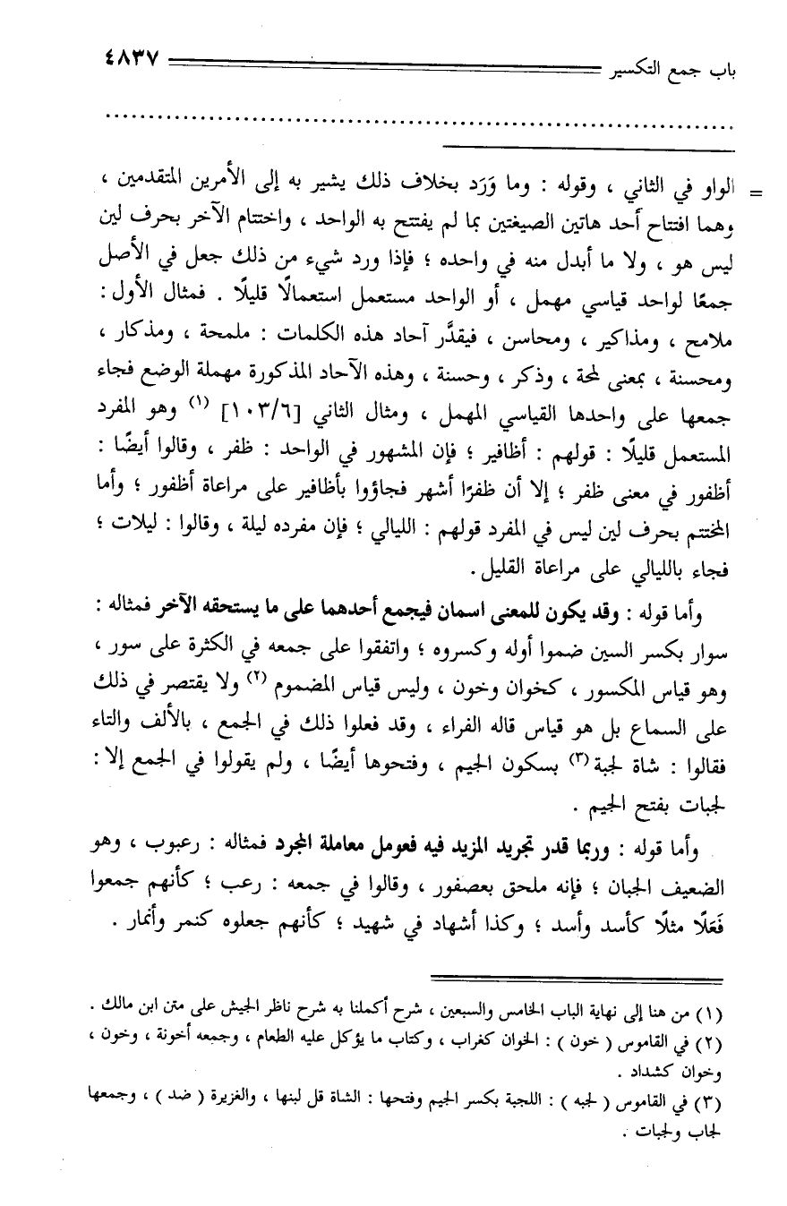بما لم يفتتح به الواحد، واختتام الآخر بحرف لين ليس هو، ولا ما أبدل منه في واحده؛ فإذا ورد شيء من ذلك جعل في الأصل جمعا لواحد قياسي مهمل، أو الواحد مستعمل استعمالا قليلا. فمثال الأول: