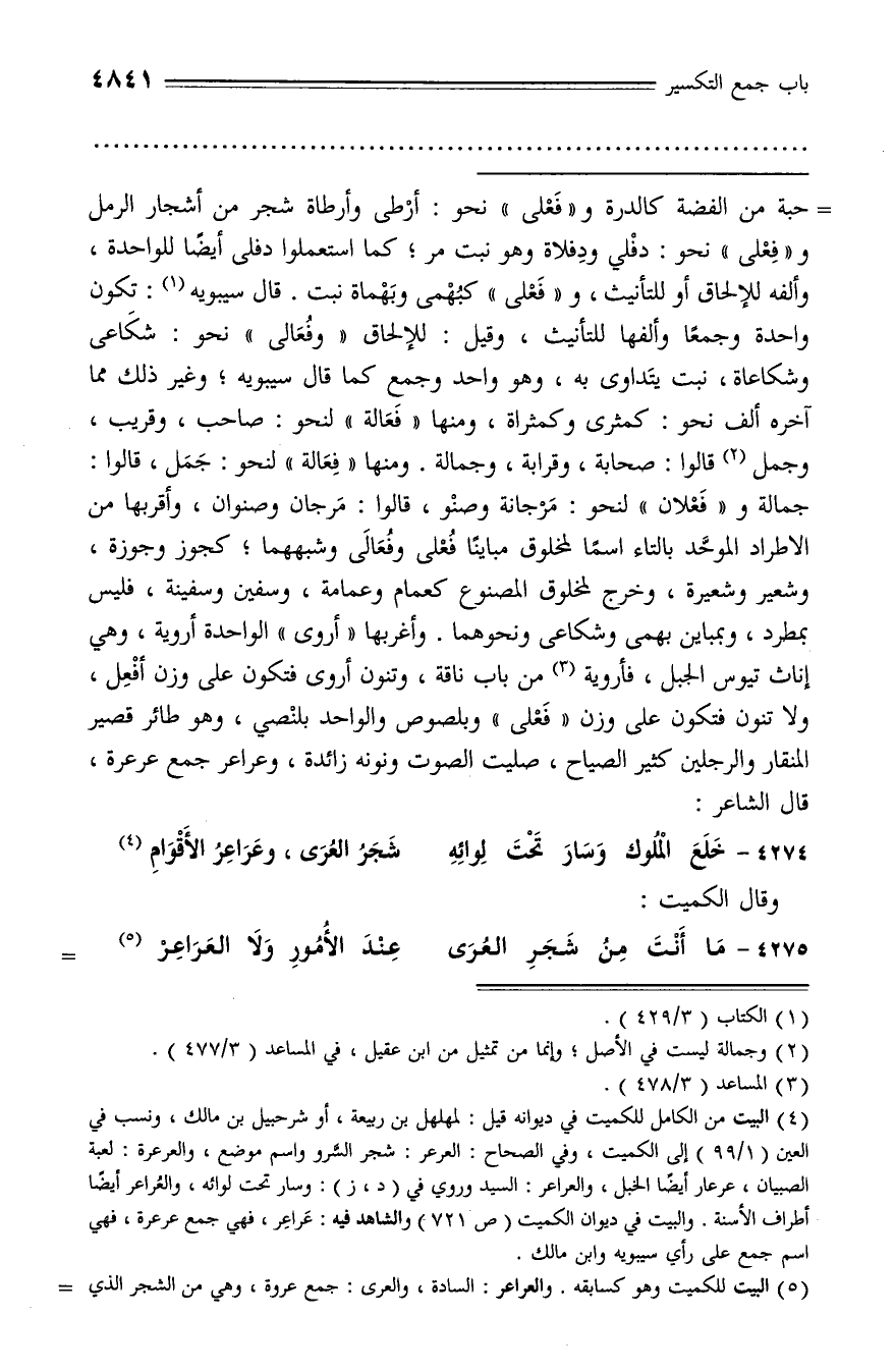 حبة من الفضة كالدرة و «فعلى» نحو: أرطى وأرطاة شجر من أشجار الرمل و «فعلى» نحو: دفلي ودفلاة وهو نبت مر؛ كما استعملوا دفلى أيضا للواحدة، وألفه للإلحاق أو للتأنيث، و «فعلى» كبهمى وبهماة نبت. قال سيبويه (¬1): تكون واحدة وجمعا وألفها للتأنيث، وقيل: للإلحاق «وفعالى» نحو: شكاعى وشكاعاة، نبت يتداوى به، وهو واحد وجمع كما قال سيبويه؛ وغير ذلك مما آخره ألف نحو: كمثرى وكمثراة، ومنها «فعالة» لنحو: صاحب، وقريب، وجمل (¬2) قالوا: صحابة، وقرابة، وجمالة. ومنها «فعالة» لنحو: جمل، قالوا: