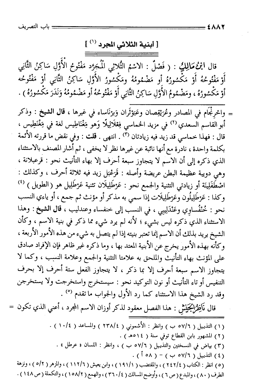 اصطفلينة أو زيادتي التثنية والجمع نحو: عرطليلان تثنية عرطليل هو (الطويل) (¬4) وكذا: عرطليلون وعرطليلات إذا سمي به مذكر أو مؤنث ثم جمع، أو ياءي النسب نحو: خنفساوي وعندليبي، في النسب إلى خنفساء وعندليب، قال الشيخ: وهذا الاستثناء الذي ذكره ليس بشيء؛ لأنه لم يرد شيء مما ذكر في بنية الاسم، وكأن الشيخ يريد بذلك أن الاسم إنما تعتبر بنيته إذا لم يتصل به شيء من هذه الأمور الأربعة، وكأنه بهذه الأمور يخرج عن الأبنية