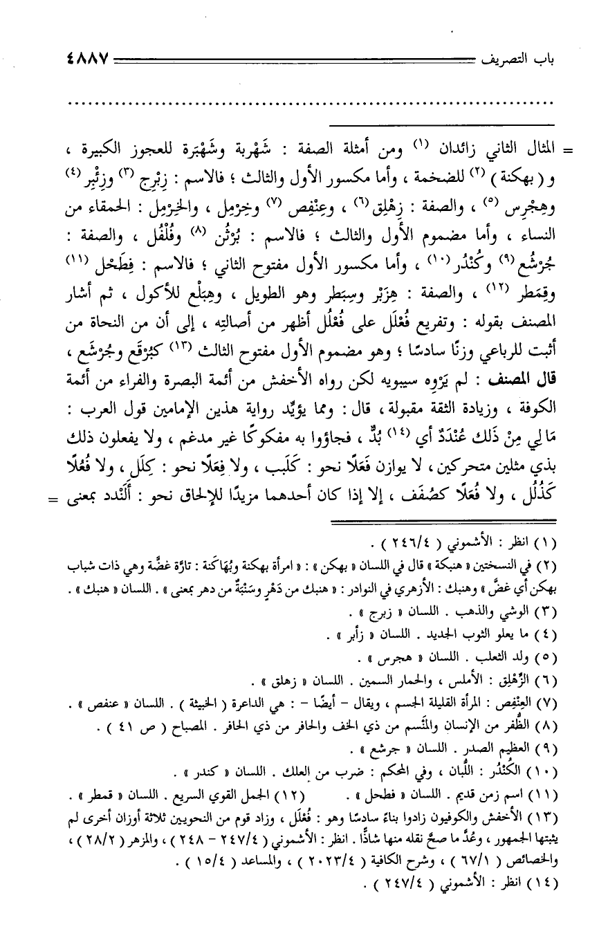المثال الثاني زائدان (¬1) ومن أمثلة الصفة: شهربة وشهبرة للعجوز الكبيرة، و (بهكنة) (¬2) للضخمة، وأما مكسور الأول والثالث؛ فالاسم: زبرج (¬3) وزئبر (¬4) وهجرس (¬5)، والصفة: زهلق (¬6)، وعنفص (¬7) وخرمل، والخرمل: الحمقاء من النساء، وأما مضموم الأول والثالث؛ فالاسم: برثن (¬8) وفلفل، والصفة: