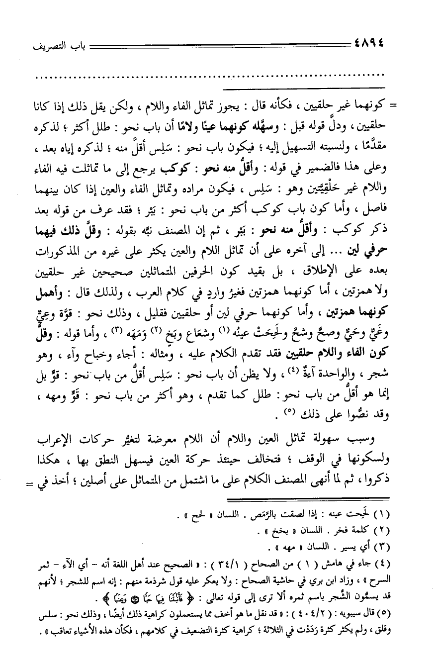 كونهما غير حلقيين، فكأنه قال: يجوز تماثل الفاء واللام، ولكن يقل ذلك إذا كانا حلقيين، ودلّ قوله قبل: وسهّله كونهما عينا ولاما أن باب نحو: طلل أكثر؛ لذكره مقدّما، ولنسبته التسهيل إليه؛ فيكون باب نحو: سلس أقلّ منه؛ لذكره إياه بعد، وعلى هذا فالضمير في قوله: وأقلّ منه نحو: كوكب يرجع إلى ما تماثلت فيه الفاء واللام غير حلقيّتين وهو: سلس، فيكون مراده وتماثل الفاء والعين إذا كان بينهما فاصل، وأما كون باب كوكب أكثر من باب نحو: ببر؛ فقد عرف من قوله بعد ذكر كوكب: وأقلّ منه نحو: ببر، ثم إن المصنف نبّه بقوله: وقلّ ذلك فيهما حرفي