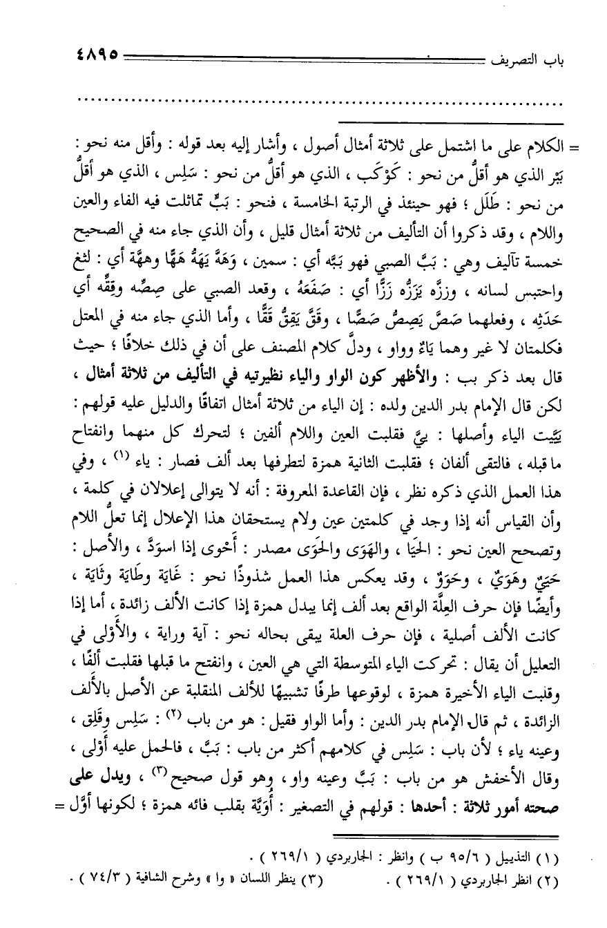 حيي وهوي، وحوو، وقد يعكس هذا العمل شذوذا نحو: غاية وطاية وثاية، وأيضا فإن حرف العلّة الواقع بعد ألف إنما يبدل همزة إذا كانت الألف زائدة، أما إذا كانت الألف أصلية، فإن حرف العلة يبقى بحاله نحو: آية وراية، والأولى في التعليل أن يقال: تحركت الياء المتوسطة التي هي العين، وانفتح ما قبلها فقلبت ألفا، وقلبت الياء الأخيرة همزة، لوقوعها طرفا تشبيها للألف المنقلبة عن الأصل بالألف الزائدة، ثم قال الإمام بدر الدين: وأما الواو فقيل: هو من باب (¬2): سلس وقلق، وعينه ياء؛ لأن باب: سلس في كلامهم أكثر من باب: ببّ، فالحمل عليه أولى، وقال الأخفش هو من باب: ببّ وعينه واو، وهو قول صحيح (¬3)، ويدل على صحته أمور ثلاثة: أحدها: قولهم في التصغير: أويّة بقلب فائه همزة؛ لكونها أوّل -