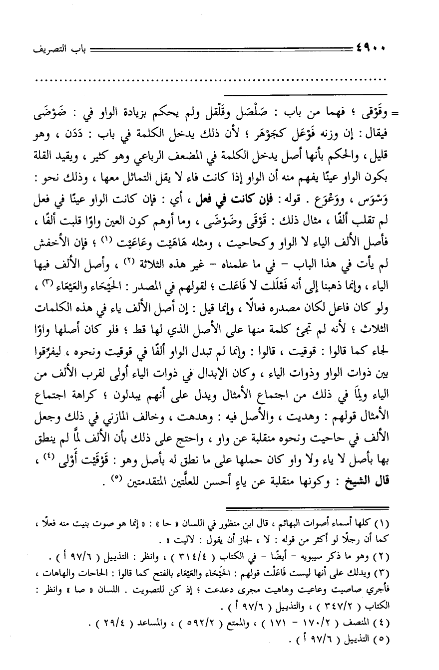 وقوقى؛ فهما من باب: صلصل وقلقل ولم يحكم بزيادة الواو في: ضوضى فيقال: إن وزنه فوعل كجوهر؛ لأن ذلك يدخل الكلمة في باب: ددن، وهو قليل، والحكم بأنها أصل يدخل الكلمة في المضعف الرباعي وهو كثير، ويقيد القلة بكون الواو عينا يفهم منه أن الواو إذا كانت فاء لا يقل التماثل معها، وذلك نحو: