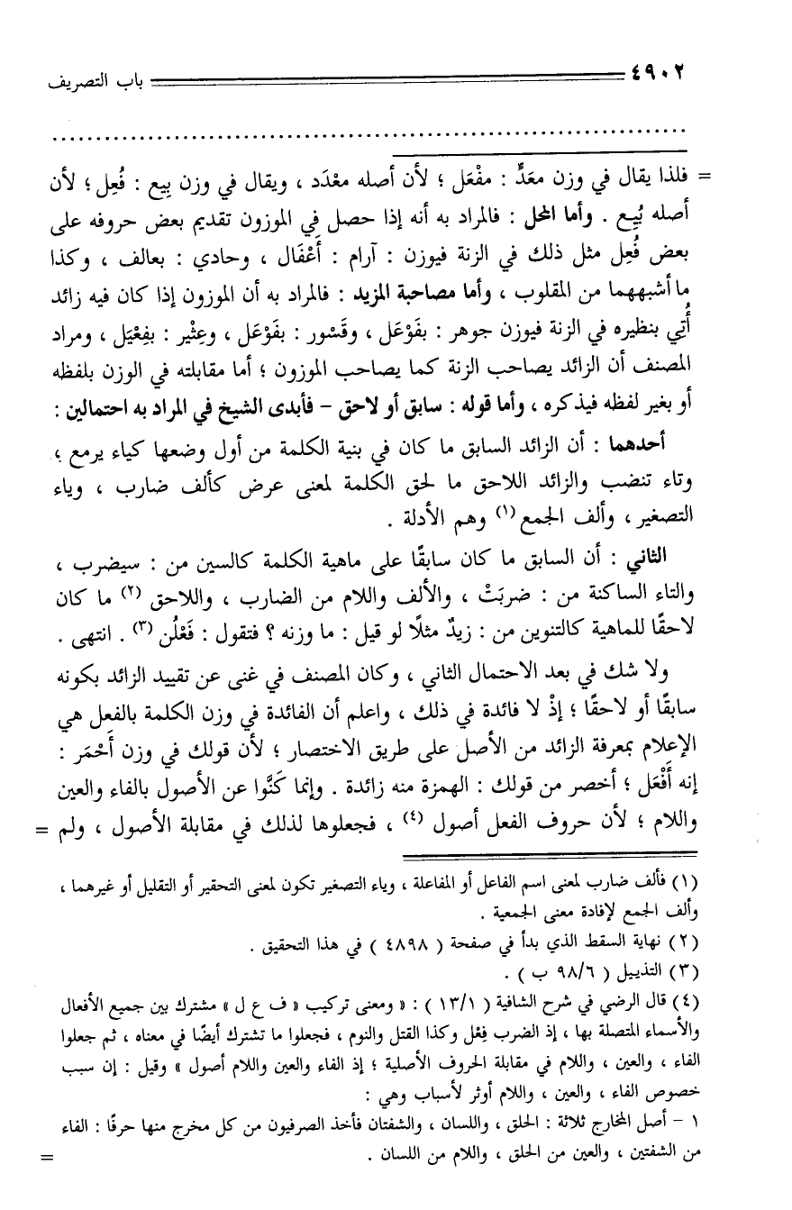 فلذا يقال في وزن معدّ: مفعل؛ لأن أصله معدد، ويقال في وزن بيع: فعل؛ لأن أصله بيع. وأما المحل: فالمراد به أنه إذا حصل في الموزون تقديم بعض حروفه على بعض فعل مثل ذلك في الزنة فيوزن: آرام: أعفال، وحادي: بعالف، وكذا ما أشبههما من المقلوب، وأما مصاحبة المزيد: فالمراد به أن الموزون إذا كان فيه زائد أتي بنظيره في الزنة فيوزن جوهر: بفوعل، وقسور: بفوعل، وعثير: بفعيل، ومراد المصنف أن الزائد يصاحب الزنة كما يصاحب الموزون؛ أما مقابلته في الوزن بلفظه أو بغير لفظه فيذكره، وأما قوله: سابق أو لاحق - فأبدى الشيخ في المراد به احتمالين: