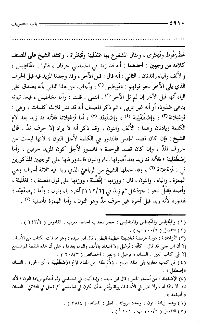 عضرفوط وقبعثرى، ومثال المشفوع بها عندليبة وقبعثراة، وانتقد الشيخ على المصنف كلامه من وجهين: أحدهما: أنه قد زيد في الخماسي حرفان، قالوا: مغناطيس، والألف والياء زائدتان. الثاني: أنه قال: قبل الآخر، وقد وجدنا المزيد فيه قبل الحرف الذي يلي الآخر نحو قولهم: مغنيطس (¬1)، وأجاب عن هذا الثاني بأنه يصدق على الياء أنها قبل الآخر إن لم تل الآخر (¬2). انتهى. قلت: وأما مغناطيس، فبعد ثبوته يدعى شذوذه أو أنه غير عربي، ثم ذكر المصنف أنه قد ندر ثلاث كلمات، وهي:
