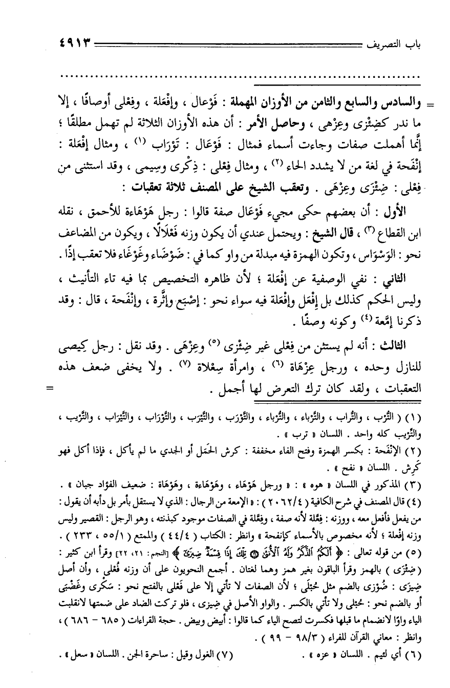 والسادس والسابع والثامن من الأوزان المهملة: فوعال، وإفعلة، وفعلى أوصافا، إلا ما ندر كضئزى وعزهى، وحاصل الأمر: أن هذه الأوزان الثلاثة لم تهمل مطلقا؛ إنّما أهملت صفات وجاءت أسماء فمثال: فوعال: توراب (¬1)، ومثال إفعلة: