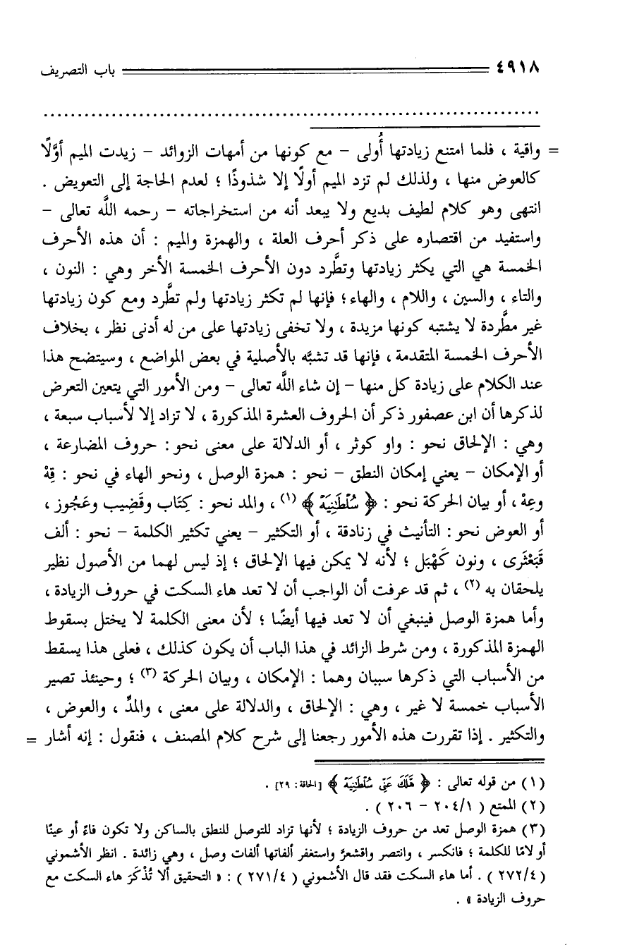 (¬3) همزة الوصل تعد من حروف الزيادة؛ لأنها تزاد للتوصل للنطق بالساكن ولا تكون فاء أو عينا أو لاما للكلمة؛ فانكسر، وانتصر واقشعرّ واستغفر ألفاتها ألفات وصل، وهي زائدة. انظر الأشموني (4/ 272). أما هاء السكت فقد قال الأشموني (4/ 271): «التحقيق ألا تذكر هاء السكت مع حروف الزيادة».