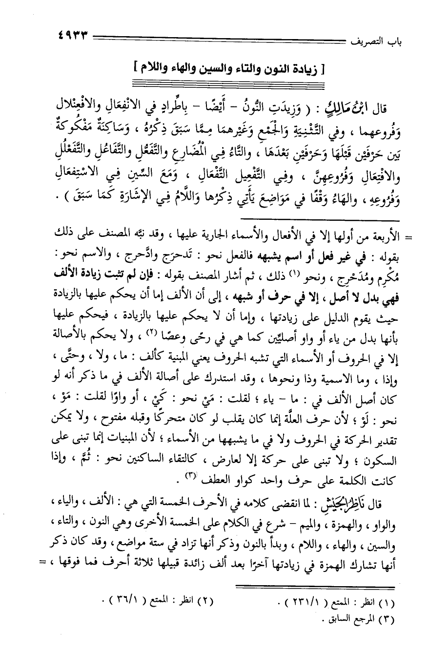 قال ابن مالك: (وزيدت النّون - أيضا - باطّراد في الانفعال والافعنلال وفروعهما، وفي التّثنية والجمع وغيرهما ممّا سبق ذكره، وساكنة مفكوكة بين حرفين قبلها وحرفين بعدها، والتّاء في المضارع والتّفعّل والتّفاعل والتّفعلل والافتعال وفروعهنّ، وفي التّفعيل التّفعال، ومع السّين في الاستفعال وفروعه، والهاء وقفا في مواضع يأتي ذكرها واللّام في الإشارة كما سبق).