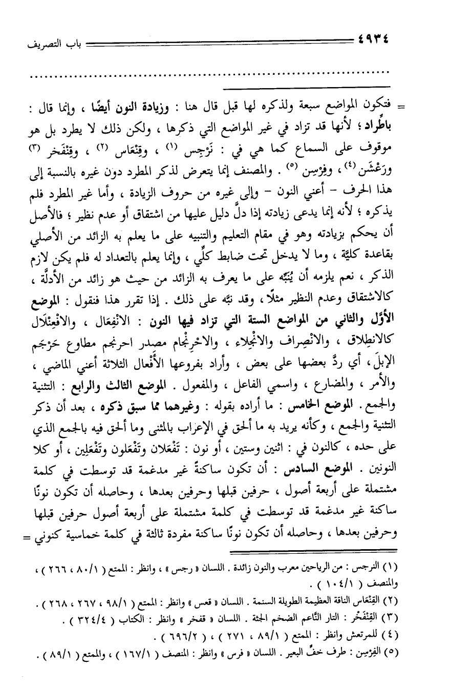 باطّراد؛ لأنها قد تزاد في غير المواضع التي ذكرها، ولكن ذلك لا يطرد بل هو موقوف على السماع كما هي في: نرجس (¬1)، وقنعاس (¬2)، وقنفخر (¬3) ورعشن (¬4)، وفرسن (¬5). والمصنف إنما يتعرض لذكر المطرد دون غيره بالنسبة إلى هذا الحرف - أعني النون - وإلى غيره من حروف الزيادة، وأما غير المطرد فلم يذكره؛ لأنه إنما يدعى زيادته إذا دلّ دليل عليها من اشتقاق أو عدم نظير؛ فالأصل أن يحكم بزيادته وهو في مقام التعليم والتنبيه على ما يعلم به الزائد من الأصلي بقاعدة كليّة، وما لا يدخل تحت ضابط كلّي، وإنما يعلم بالتعداد له فلم يكن لازم الذكر، نعم يلزمه أن ينبّه على ما يعرف به الزائد من حيث هو زائد من الأدلّة، كالاشتقاق وعدم النظير مثلا، وقد نبّه على ذلك. إذا تقرر هذا فنقول: الموضع الأوّل والثاني من المواضع الستة التي تزاد فيها النون: الانفعال، والافعنلال كالانطلاق، والانصراف والانجلاء، والاحرنجام مصدر احرنجم مطاوع حرجم الإبل، أي ردّ بعضها على بعض، وأراد بفروعها الأفعال الثلاثة أعني الماضي، والأمر، والمضارع، واسمي الفاعل، والمفعول. الموضع الثالث والرابع: التثنية والجمع. الموضع الخامس: ما أراده بقوله: وغيرهما مما سبق ذكره، بعد أن ذكر التثنية والجمع، وكأنه يريد به ما ألحق في الإعراب بالمثنى وما ألحق فيه بالجمع الذي على حده، كالنون في: اثنين وستين، أو نون: تفعلان وتفعلون وتفعلين، أو كلا النونين. الموضع السادس: أن تكون ساكنة غير مدغمة قد توسطت في كلمة مشتملة على أربعة أصول، حرفين قبلها وحرفين بعدها، وحاصله أن تكون نونا ساكنة غير مدغمة قد توسطت في كلمة مشتملة على أربعة أصول حرفين قبلها وحرفين بعدها، وحاصله أن تكون نونا ساكنة مفردة ثالثة في كلمة خماسية كنوني -