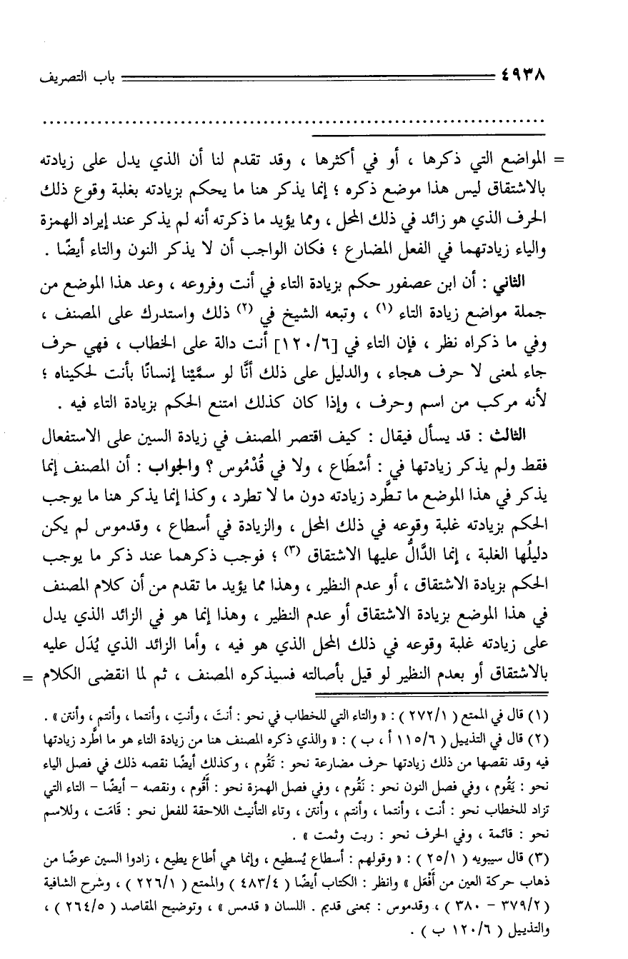 الثالث: قد يسأل فيقال: كيف اقتصر المصنف في زيادة السين على الاستفعال فقط ولم يذكر زيادتها في: أسطاع، ولا في قدموس؟ والجواب: أن المصنف إنما يذكر في هذا الموضع ما تطّرد زيادته دون ما لا تطرد، وكذا إنما يذكر هنا ما يوجب الحكم بزيادته غلبة وقوعه في ذلك المحل، والزيادة في أسطاع، وقدموس لم يكن دليلها الغلبة، إنما الدّالّ عليها الاشتقاق (¬3)؛ فوجب ذكرهما عند ذكر ما يوجب الحكم بزيادة الاشتقاق، أو عدم النظير، وهذا مما يؤيد ما تقدم من أن كلام المصنف في هذا الموضع بزيادة الاشتقاق أو عدم النظير، وهذا إنما هو في الزائد الذي يدل على زيادته غلبة وقوعه في ذلك المحل الذي هو فيه، وأما الزائد الذي يدل عليه بالاشتقاق أو بعدم النظير لو قيل بأصالته فسيذكره المصنف، ثم لما انقضى الكلام -