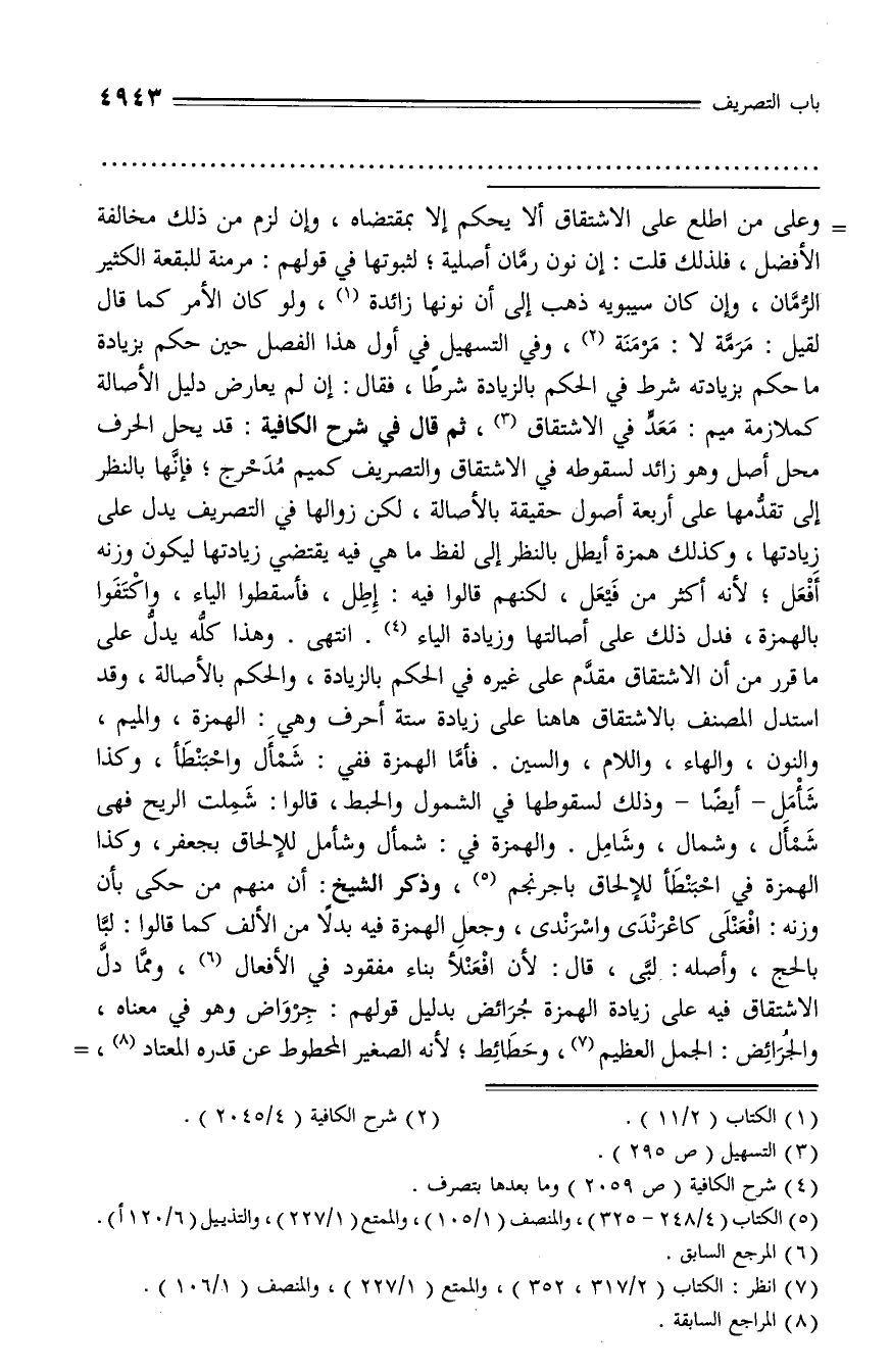 مقدّم على غيره في الحكم بالزيادة، والحكم بالأصالة، وقد استدل المصنف بالاشتقاق هاهنا على زيادة ستة أحرف وهي: الهمزة، والميم، والنون، والهاء، واللام، والسين. فأمّا الهمزة ففي: شمأل واحبنطأ، وكذا شأمل - أيضا - وذلك لسقوطها في الشمول والحبط، قالوا: شملت الريح فهى شمأل، وشمال، وشامل. والهمزة في: شمأل وشأمل للإلحاق بجعفر، وكذا الهمزة في احبنطأ للإلحاق باجرنجم (¬5)، وذكر الشيخ: أن منهم من حكى بأن وزنه: افعنلى كاعرندى واسرندى، وجعل الهمزة فيه بدلا من الألف كما قالوا: لبّا بالحج، وأصله: لبّى، قال: لأن افعنلأ بناء مفقود في الأفعال (¬6)، وممّا دلّ الاشتقاق فيه على زيادة الهمزة جرائض بدليل قولهم: جرواض وهو في معناه، والجرائض: الجمل العظيم (¬7)، وحطائط؛ لأنه الصغير المحطوط عن قدره المعتاد (¬8)، -