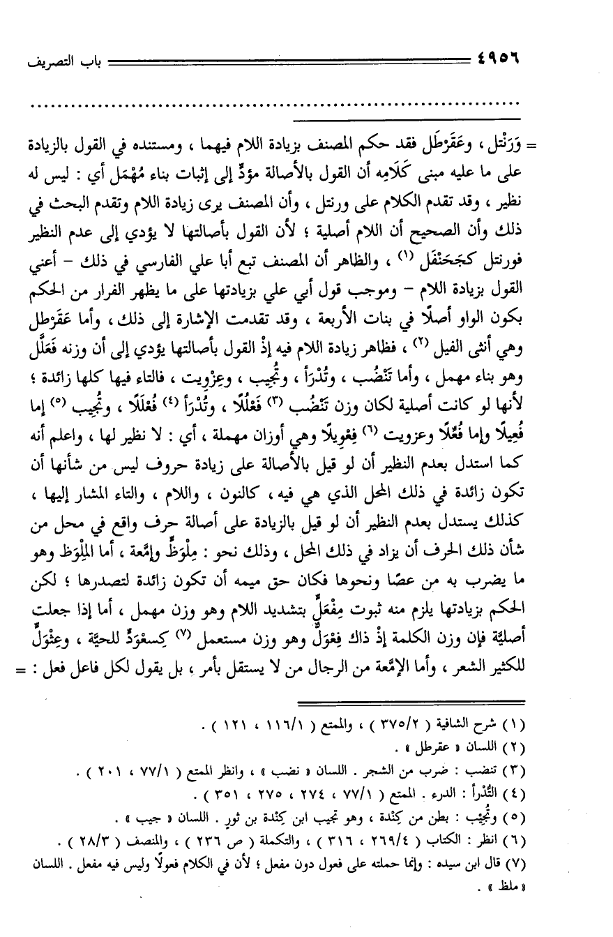 ورنتل، وعقرطل فقد حكم المصنف بزيادة اللام فيهما، ومستنده في القول بالزيادة على ما عليه مبنى كلامه أن القول بالأصالة مؤدّ إلى إثبات بناء مهمل أي: ليس له نظير، وقد تقدم الكلام على ورنتل، وأن المصنف يرى زيادة اللام وتقدم البحث في ذلك وأن الصحيح أن اللام أصلية؛ لأن القول بأصالتها لا يؤدي إلى عدم النظير فورنتل كجحنفل (¬1)، والظاهر أن المصنف تبع أبا علي الفارسي في ذلك - أعني القول بزيادة اللام - وموجب قول أبي علي بزيادتها على ما يظهر الفرار من الحكم بكون الواو أصلا في بنات الأربعة، وقد تقدمت الإشارة إلى ذلك، وأما عقرطل وهي أنثى الفيل (¬2)، فظاهر زيادة اللام فيه إذ القول بأصالتها يؤدي إلى أن وزنه فعلّل وهو بناء مهمل، وأما تنضب، وتدرأ، وتجيب، وعزويت، فالتاء فيها كلها زائدة؛ لأنها لو كانت أصلية لكان وزن تنضب (¬3) فعللا، وتدرأ (¬4) فعللا، وتجيب (¬5) إما فعيلا وإما فعّلا وعزويت (¬6) فعويلا وهي أوزان مهملة، أي: لا نظير لها، واعلم أنه كما استدل بعدم النظير أن لو قيل بالأصالة على زيادة حروف ليس من شأنها أن تكون زائدة في ذلك المحل الذي هي فيه، كالنون، واللام، والتاء المشار إليها، كذلك يستدل بعدم النظير أن لو قيل بالزيادة على أصالة حرف واقع في محل من شأن ذلك الحرف أن يزاد في ذلك المحل، وذلك نحو: ملوظّ وإمّعة، أما الملوظ وهو ما يضرب به من عصا ونحوها فكان حق ميمه أن تكون زائدة لتصدرها؛ لكن الحكم بزيادتها يلزم منه ثبوت مفعلّ