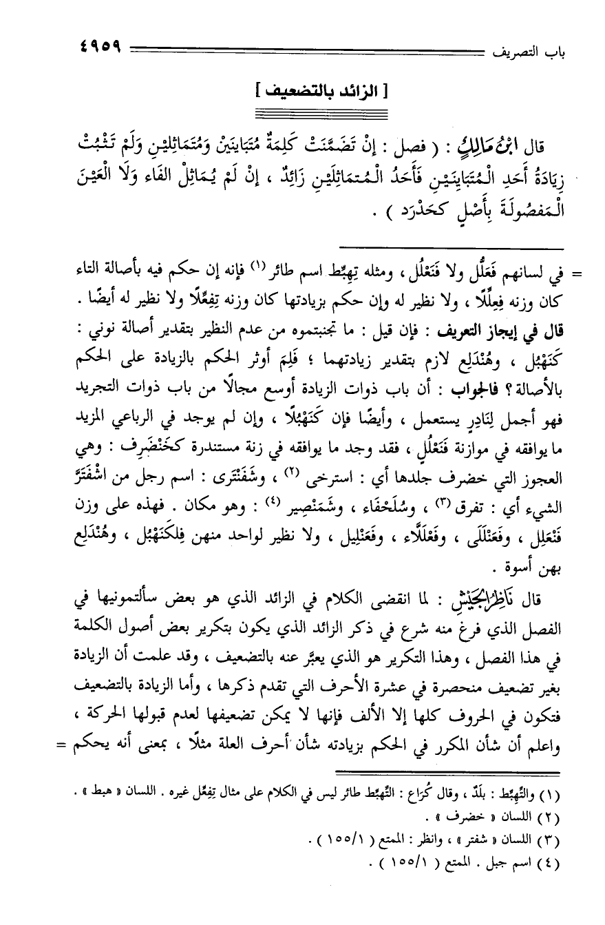 قال ناظر الجيش: لما انقضى الكلام في الزائد الذي هو بعض سألتمونيها في الفصل الذي فرغ منه شرع في ذكر الزائد الذي يكون بتكرير بعض أصول الكلمة في هذا الفصل، وهذا التكرير هو الذي يعبّر عنه بالتضعيف، وقد علمت أن الزيادة بغير تضعيف منحصرة في عشرة الأحرف التي تقدم ذكرها، وأما الزيادة بالتضعيف فتكون في الحروف كلها إلا الألف فإنها لا يمكن تضعيفها لعدم قبولها الحركة، واعلم أن شأن المكرر في الحكم بزيادته شأن أحرف العلة مثلا، بمعنى أنه يحكم -
