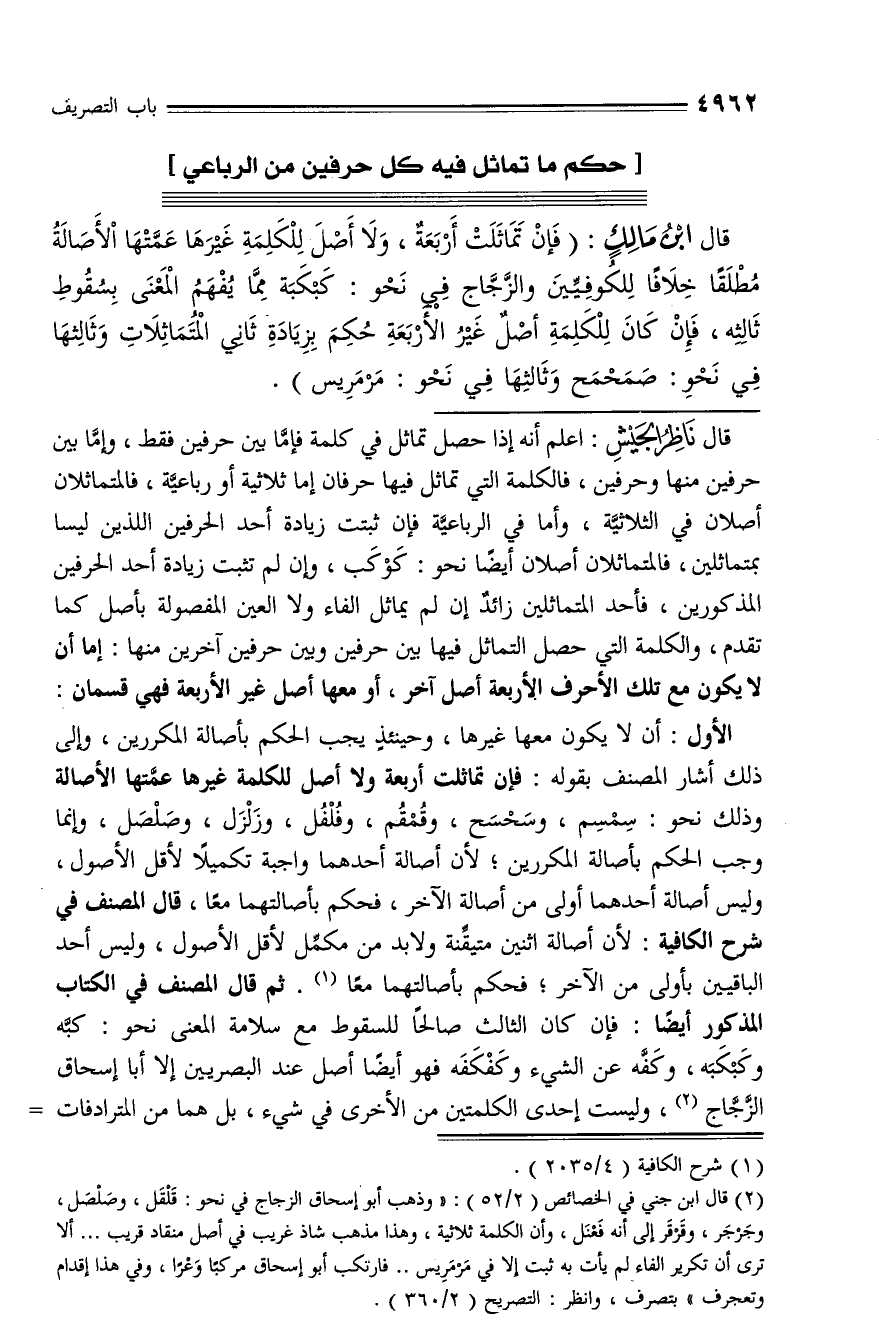قال ناظر الجيش: اعلم أنه إذا حصل تماثل في كلمة فإمّا بين حرفين فقط، وإمّا بين حرفين منها وحرفين، فالكلمة التي تماثل فيها حرفان إما ثلاثية أو رباعيّة، فالمتماثلان أصلان في الثلاثيّة، وأما في الرباعيّة فإن ثبتت زيادة أحد الحرفين اللذين ليسا بمتماثلين، فالمتماثلان أصلان أيضا نحو: كوكب، وإن لم تثبت زيادة أحد الحرفين المذكورين، فأحد المتماثلين زائد إن لم يماثل الفاء ولا العين المفصولة بأصل كما تقدم، والكلمة التي حصل التماثل فيها بين حرفين وبين حرفين آخرين منها: إما أن لا يكون مع تلك الأحرف الأربعة أصل آخر، أو معها أصل غير الأربعة فهي قسمان:
