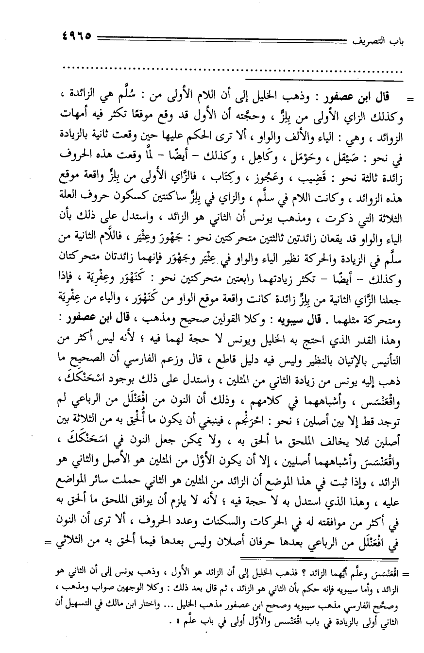 = اقعنسس وعلّم أيّهما الزائد؟ فذهب الخليل إلى أن الزائد هو الأول، وذهب يونس إلى أن الثاني هو الزائد، وأما سيبويه فإنه حكم بأن الثاني هو الزائد، ثم قال بعد ذلك: وكلا الوجهين صواب ومذهب، وصحّح الفارسي مذهب سيبويه وصحح ابن عصفور مذهب الخليل ... واختار ابن مالك في التسهيل أن الثاني أولى بالزيادة في باب اقعنسس والأوّل أولى في باب علّم».