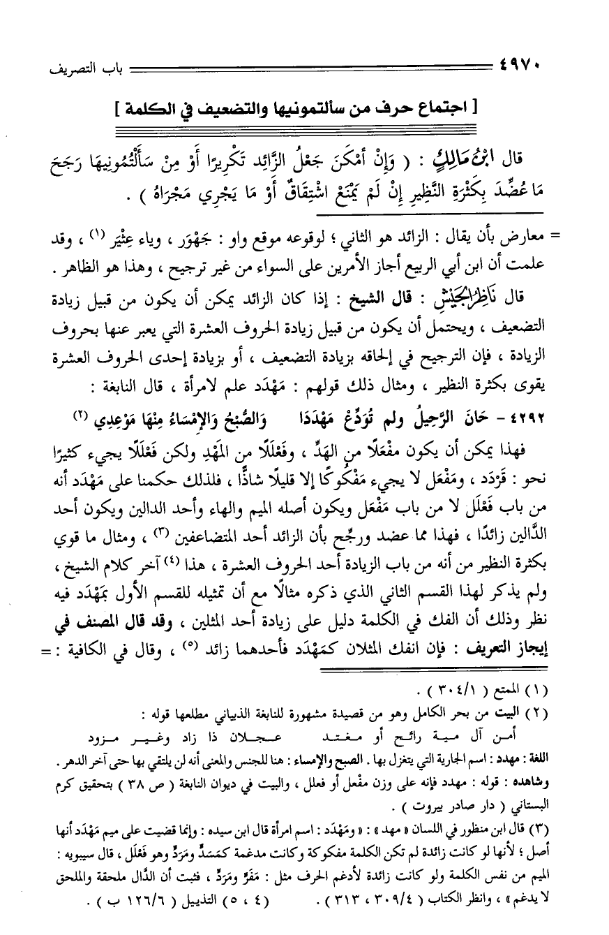 قال ناظر الجيش: قال الشيخ: إذا كان الزائد يمكن أن يكون من قبيل زيادة التضعيف، ويحتمل أن يكون من قبيل زيادة الحروف العشرة التي يعبر عنها بحروف الزيادة، فإن الترجيح في إلحاقه بزيادة التضعيف، أو بزيادة إحدى الحروف العشرة يقوى بكثرة النظير، ومثال ذلك قولهم: مهدد علم لامرأة، قال النابغة: