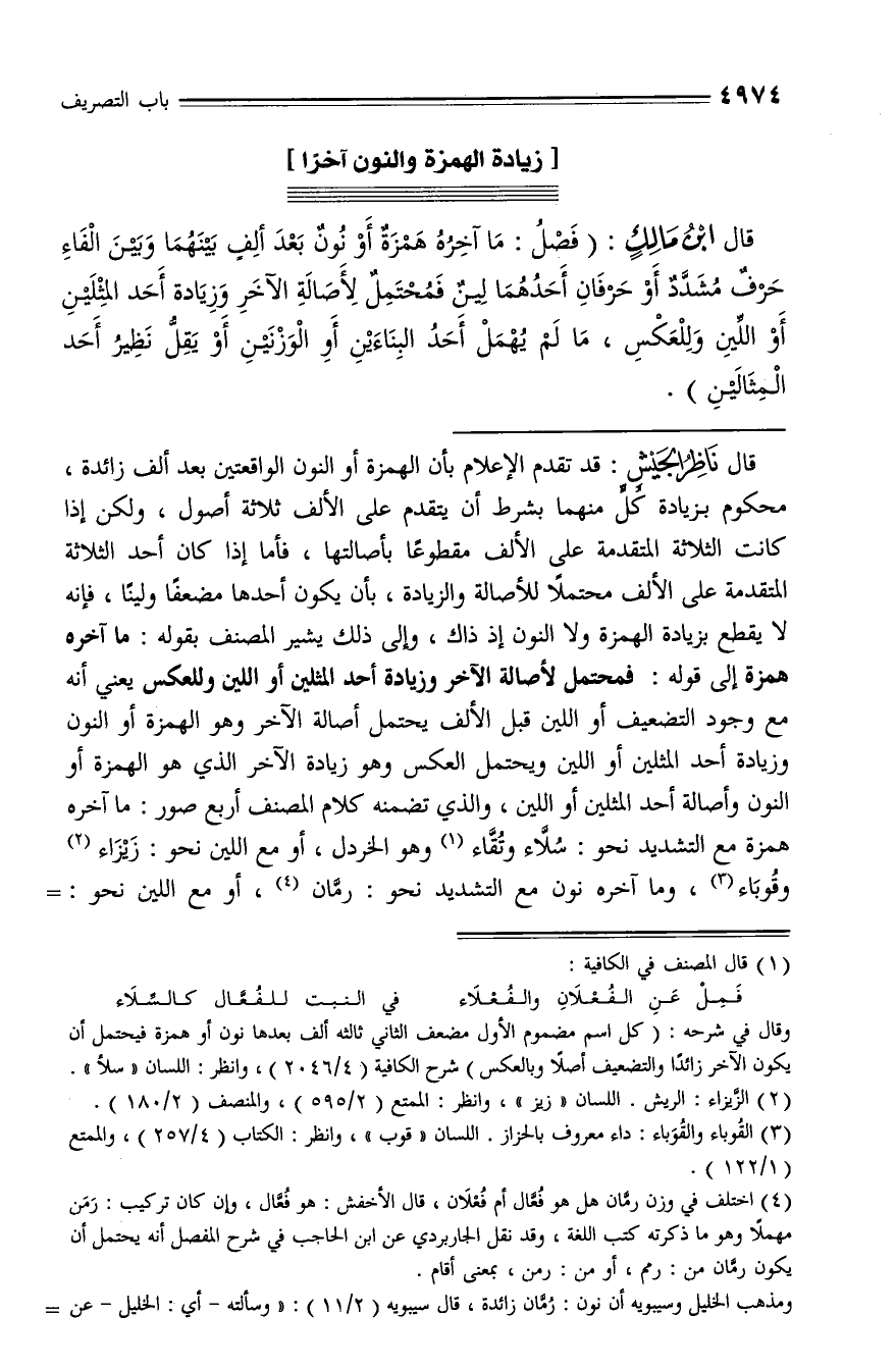 قال ابن مالك: (فصل: ما آخره همزة أو نون بعد ألف بينهما وبين الفاء حرف مشدّد أو حرفان أحدهما لين فمحتمل لأصالة الآخر وزيادة أحد المثلين أو اللّين وللعكس، ما لم يهمل أحد البناءين أو الوزنين أو يقلّ نظير أحد المثالين).