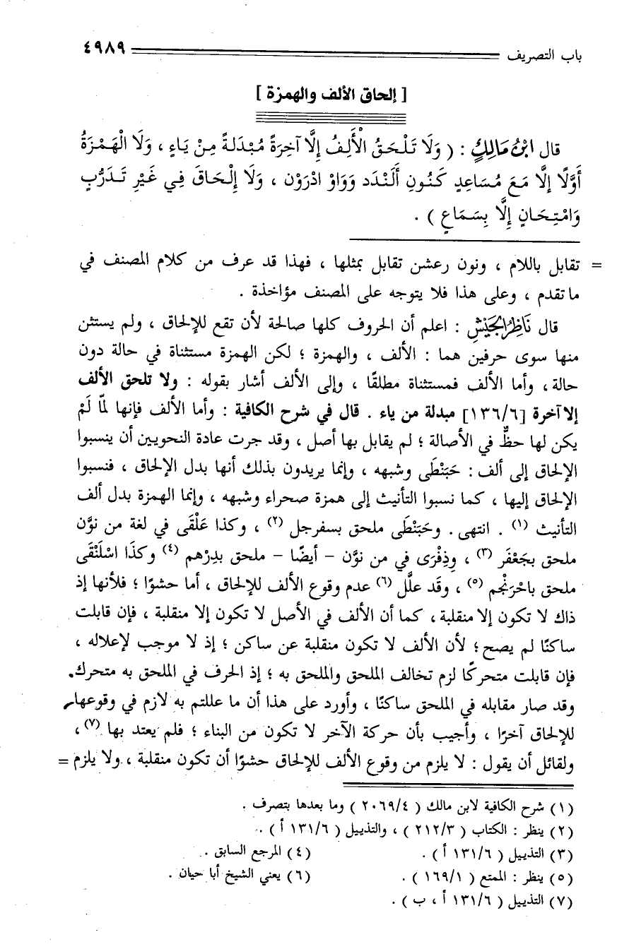 قال ناظر الجيش: اعلم أن الحروف كلها صالحة لأن تقع للإلحاق، ولم يستثن منها سوى حرفين هما: الألف، والهمزة؛ لكن الهمزة مستثناة في حالة دون حالة، وأما الألف فمستثناة مطلقا، وإلى الألف أشار بقوله: ولا تلحق الألف إلا آخرة [6/ 136] مبدلة من ياء. قال في شرح الكافية: وأما الألف فإنها لمّا لم يكن لها حظّ في الأصالة؛ لم يقابل بها أصل، وقد جرت عادة النحويين أن ينسبوا الإلحاق إلى ألف: حبنطى وشبهه، وإنما يريدون بذلك أنها بدل الإلحاق، فنسبوا الإلحاق إليها، كما نسبوا التأنيث إلى همزة صحراء وشبهه، وإنما الهمزة بدل ألف التأنيث (¬1). انتهى. وحبنطى ملحق بسفرجل (¬2)، وكذا علقى في لغة من نوّن ملحق بجعفر (¬3)، وذفرى في من نوّن - أيضا - ملحق بدرهم (¬4) وكذا اسلنقى ملحق باحرنجم (¬5)، وقد علّل (¬6) عدم وقوع الألف للإلحاق، أما حشوا؛ فلأنها إذ ذاك لا تكون إلا منقلبة، كما أن الألف في الأصل لا تكون إلا منقلبة، فإن قابلت ساكنا لم يصح؛ لأن الألف لا تكون منقلبة عن ساكن؛ إذ لا موجب لإعلاله، فإن قابلت متحركا لزم تخالف الملحق والملحق به؛ إذ الحرف في الملحق به متحرك.