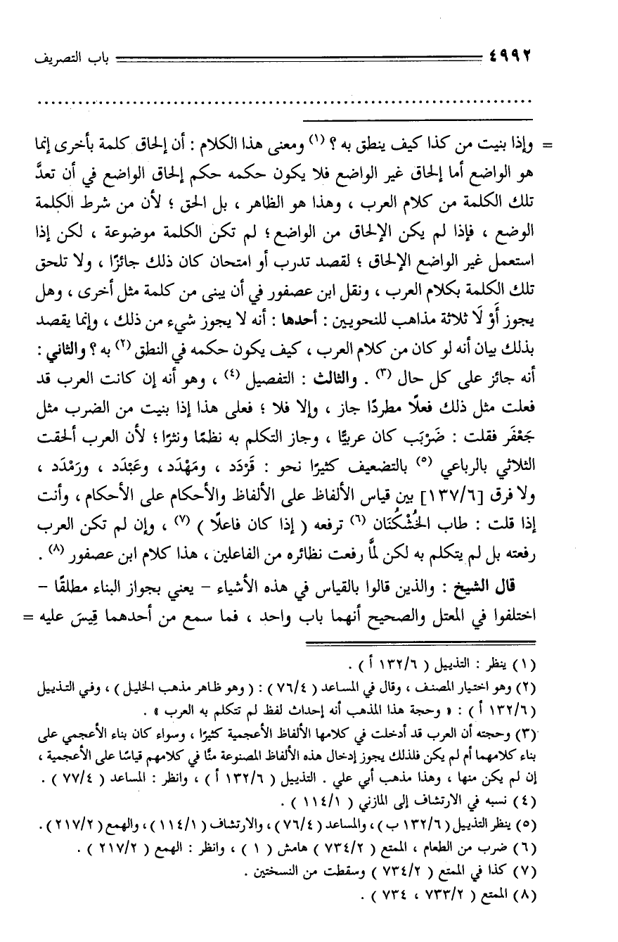 (¬2) وهو اختيار المصنف، وقال في المساعد (4/ 76): (وهو ظاهر مذهب الخليل)، وفي التذييل (6/ 132 أ): «وحجة هذا المذهب أنه إحداث لفظ لم تتكلم به العرب».