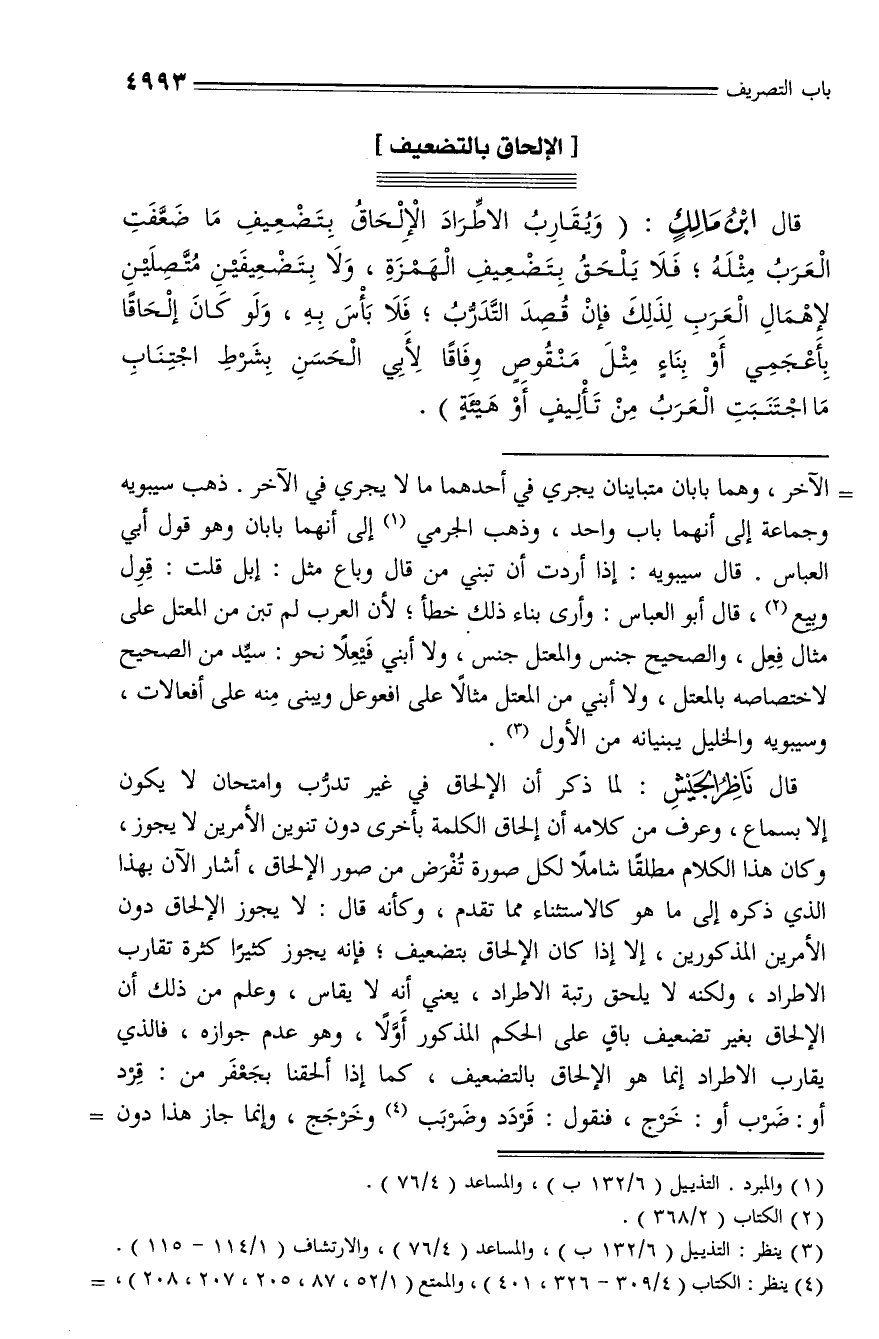 قال ناظر الجيش: لما ذكر أن الإلحاق في غير تدرّب وامتحان لا يكون إلا بسماع، وعرف من كلامه أن إلحاق الكلمة بأخرى دون تنوين الأمرين لا يجوز، وكان هذا الكلام مطلقا شاملا لكل صورة تفرض من صور الإلحاق، أشار الآن بهذا الذي ذكره إلى ما هو كالاستثناء مما تقدم، وكأنه قال: لا يجوز الإلحاق دون الأمرين المذكورين، إلا إذا كان الإلحاق بتضعيف؛ فإنه يجوز كثيرا كثرة تقارب الاطراد، ولكنه لا يلحق رتبة الاطراد، يعني أنه لا يقاس، وعلم من ذلك أن الإلحاق بغير تضعيف باق على الحكم المذكور أوّلا، وهو عدم جوازه، فالذي يقارب الاطراد إنما هو الإلحاق بالتضعيف، كما إذا ألحقنا بجعفر من: قرد أو: ضرب أو: خرج، فنقول: قردد وضربب (¬4) وخرجج،