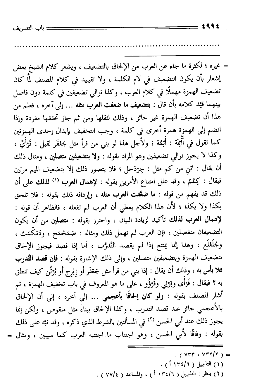 غيره؛ لكثرة ما جاء عن العرب من الإلحاق بالتضعيف، ويشعر كلام الشيخ بعض إشعار بأن يكون التضعيف في لام الكلمة، ولا تقييد في كلام المصنف لمّا كان تضعيف الهمزة مهملا في كلام العرب، وكذا توالي تضعيفين في كلمة دون فاصل بينهما قيّد كلامه بأن قال: بتضعيف ما ضعفت العرب مثله ... إلى آخره، فعلم من هذا أن تضعيف الهمزة غير جائز، وذلك لثقلها ومن ثم جاز تحققها مفردة وإذا انضم إلى الهمزة همزة أخرى في كلمة، وجب التخفيف بإبدال إحدى الهمزتين كما تقول في أأممة: أئمّة؛ ولأجل هذا لو بني من قرأ مثل جعفر لقيل: قرأي، وكذا لا يجوز توالي تضعيفين وهو المراد بقوله: ولا بتضعيفين متصلين، ومثال ذلك أن يقال: ابن من كم مثل: جردحل؛ فلا يتصور ذلك إلا بتضعيف الميم مرتين فيقال: كمّم، وقد علل امتناع الأمرين بقوله: لإهمال العرب (¬1) لذلك على أن ذلك قد يفهم من قوله: ما ضعّفت العرب مثله، وإردافه ذلك بقوله: فلا تلحق بكذا ولا بكذا؛ لأن هذا الكلام يعطي أن العرب لم تفعله، فالظاهر أن قوله: