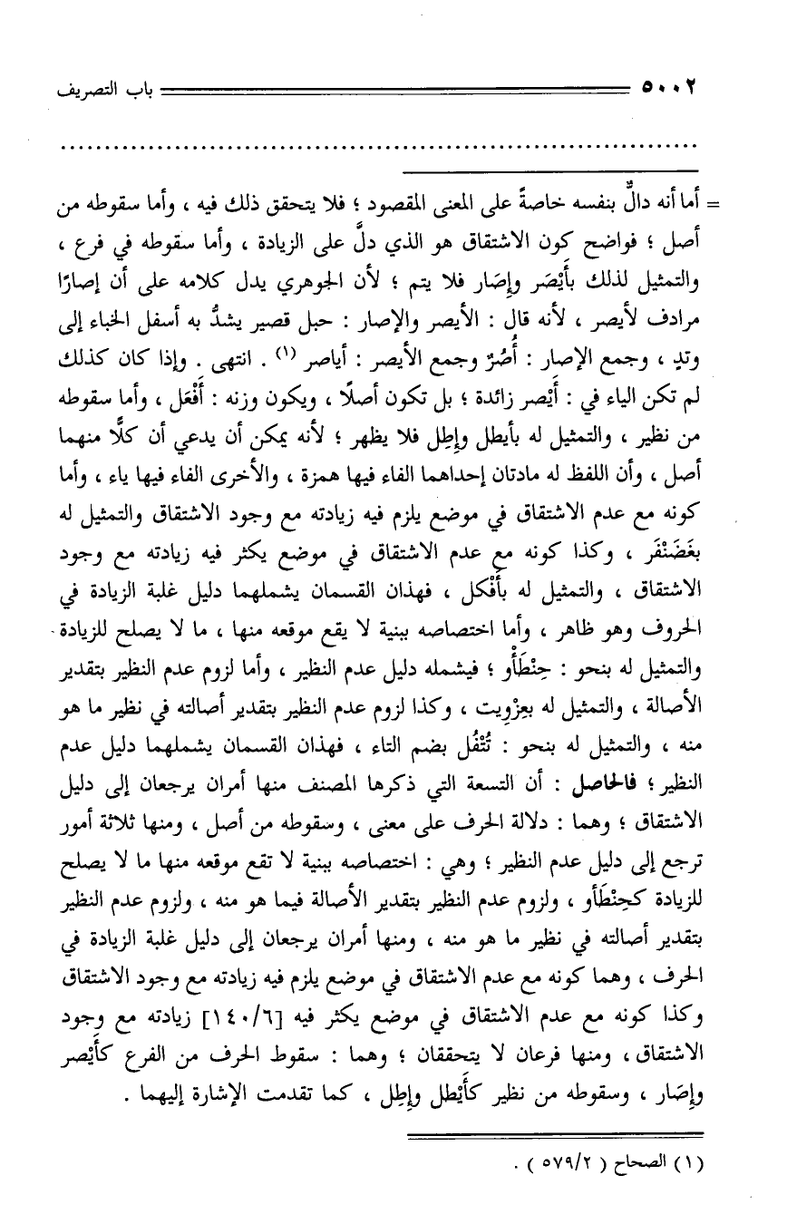 أما أنه دالّ بنفسه خاصة على المعنى المقصود؛ فلا يتحقق ذلك فيه، وأما سقوطه من أصل؛ فواضح كون الاشتقاق هو الذي دلّ على الزيادة، وأما سقوطه في فرع، والتمثيل لذلك بأيصر وإصار فلا يتم؛ لأن الجوهري يدل كلامه على أن إصارا مرادف لأيصر، لأنه قال: الأيصر والإصار: حبل قصير يشدّ به أسفل الخباء إلى وتد، وجمع الإصار: أصر وجمع الأيصر: أياصر (¬1). انتهى. وإذا كان كذلك لم تكن الياء في: أيصر زائدة؛ بل تكون أصلا، ويكون وزنه: أفعل، وأما سقوطه من نظير، والتمثيل له بأيطل وإطل فلا يظهر؛ لأنه يمكن أن يدعي أن كلّا منهما أصل، وأن اللفظ له مادتان إحداهما الفاء فيها همزة، والأخرى الفاء فيها ياء، وأما كونه مع عدم الاشتقاق في موضع يلزم فيه زيادته مع وجود الاشتقاق والتمثيل له بغضنفر، وكذا كونه مع عدم الاشتقاق في موضع يكثر فيه زيادته مع وجود الاشتقاق، والتمثيل له بأفكل، فهذان القسمان يشملهما دليل غلبة الزيادة في الحروف وهو ظاهر، وأما اختصاصه ببنية لا يقع موقعه منها، ما لا يصلح للزيادة والتمثيل له بنحو: حنطأو؛ فيشمله دليل عدم النظير، وأما لزوم عدم النظير بتقدير الأصالة، والتمثيل له بعزويت، وكذا لزوم عدم النظير بتقدير أصالته في نظير ما هو منه، والتمثيل له بنحو: تتفل بضم التاء، فهذان القسمان يشملهما دليل عدم النظير؛ فالحاصل: أن التسعة التي ذكرها المصنف منها أمران يرجعان إلى دليل الاشتقاق؛ وهما: دلالة الحرف على معنى، وسقوطه من أصل، ومنها ثلاثة أمور ترجع إلى دليل عدم النظير؛ وهي: اختصاصه ببنية لا تقع موقعه منها ما لا يصلح للزيادة كحنطأو، ولزوم عدم النظير بتقدير الأصالة فيما هو منه، ولزوم عدم النظير بتقدير أصالته في نظير ما هو منه، ومنها أمران يرجعان إلى دليل غلبة الزيادة في الحرف، وهما كونه مع عدم الاشتقاق في موضع يلزم فيه زيادته مع وجود الاشتقاق وكذا كونه مع عدم الاشتقاق في موضع يكثر فيه [6/ 140] زيادته مع وجود الاشتقاق، ومنها فرعان لا يتحققان؛ وهما: سقوط الحرف من الفرع كأيصر وإصار، وسقوطه من نظير كأيطل وإطل، كما تقدمت الإشارة إليهما.