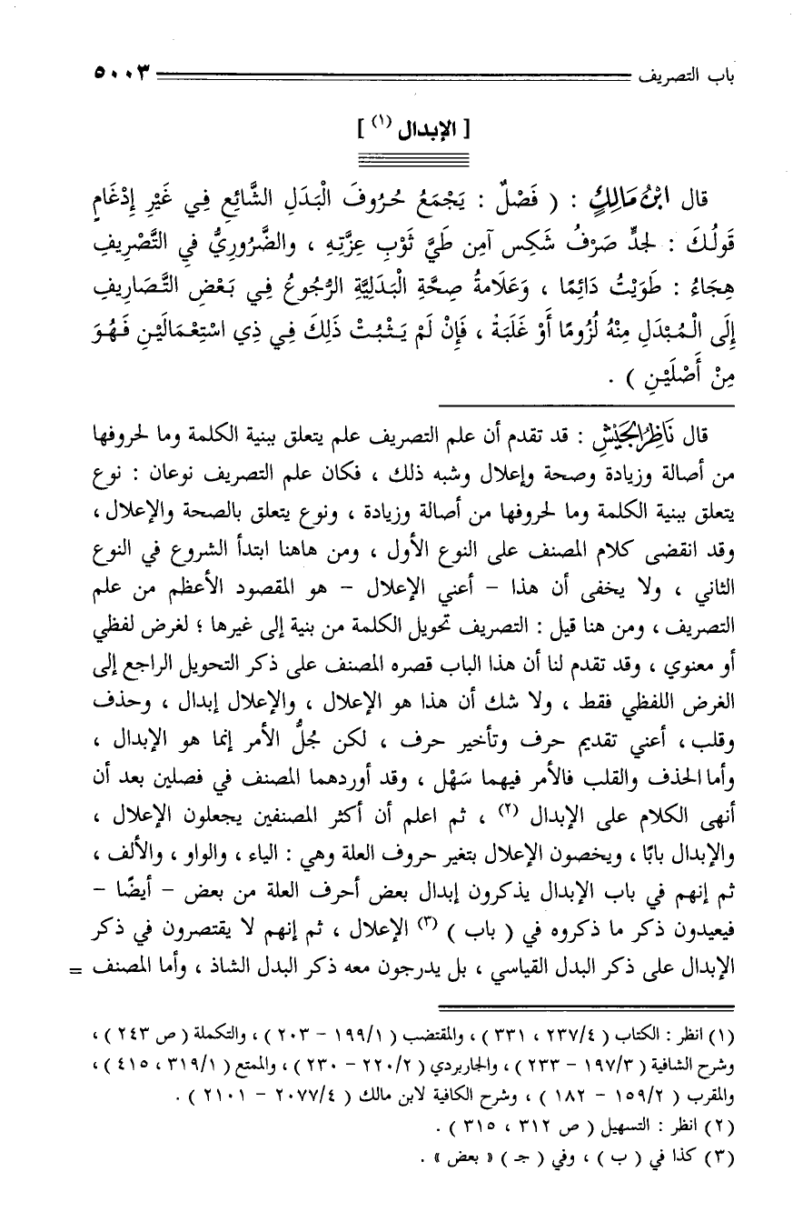 قال ناظر الجيش: قد تقدم أن علم التصريف علم يتعلق ببنية الكلمة وما لحروفها من أصالة وزيادة وصحة وإعلال وشبه ذلك، فكان علم التصريف نوعان: نوع يتعلق ببنية الكلمة وما لحروفها من أصالة وزيادة، ونوع يتعلق بالصحة والإعلال، وقد انقضى كلام المصنف على النوع الأول، ومن هاهنا ابتدأ الشروع في النوع الثاني، ولا يخفى أن هذا - أعني الإعلال - هو المقصود الأعظم من علم التصريف، ومن هنا قيل: التصريف تحويل الكلمة من بنية إلى غيرها؛ لغرض لفظي أو معنوي، وقد تقدم لنا أن هذا الباب قصره المصنف على ذكر التحويل الراجع إلى الغرض اللفظي فقط، ولا شك أن هذا هو الإعلال، والإعلال إبدال، وحذف وقلب، أعني تقديم حرف وتأخير حرف، لكن جلّ الأمر إنما هو الإبدال، وأما الحذف والقلب فالأمر فيهما سهل، وقد أوردهما المصنف في فصلين بعد أن أنهى الكلام على الإبدال (¬2)، ثم اعلم أن أكثر المصنفين يجعلون الإعلال، والإبدال بابا، ويخصون الإعلال بتغير حروف العلة وهي: الياء، والواو، والألف، ثم إنهم في باب الإبدال يذكرون إبدال بعض أحرف العلة من بعض - أيضا - فيعيدون ذكر ما ذكروه في (باب) (¬3) الإعلال، ثم إنهم لا يقتصرون في ذكر الإبدال على ذكر البدل القياسي، بل يدرجون معه ذكر البدل الشاذ، وأما المصنف -