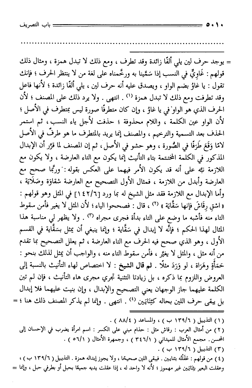 حمأة وهراة، لو ورد مثلا. ثم قال الشيخ: لا اختصاص لهاء التأنيث بالنسبة إلى العروض واللزوم بما ذكره، بل زيادتا التثنية تجري مجرى هاء التأنيث، فإن لم تبن الكلمة عليهما جاز الوجهان يعني التصحيح والإبدال، وإن بنيت عليهما فلا إبدال بل يبقى حرف اللين بحاله كثنايين (¬4). انتهى. وإنما لم يذكر المصنف ذلك هنا؛ -