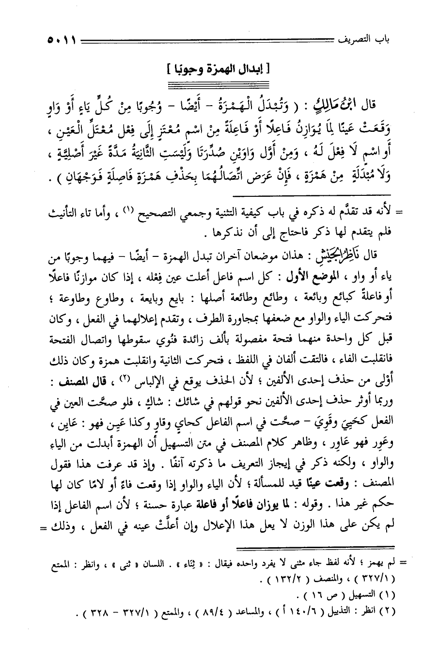 قال ناظر الجيش: هذان موضعان آخران تبدل الهمزة - أيضا - فيهما وجوبا من ياء أو واو، الموضع الأول: كل اسم فاعل أعلت عين فعله، إذا كان موازنا فاعلا أو فاعلة كبائع وبائعة، وطائع وطائعة أصلها: بايع وبايعة، وطاوع