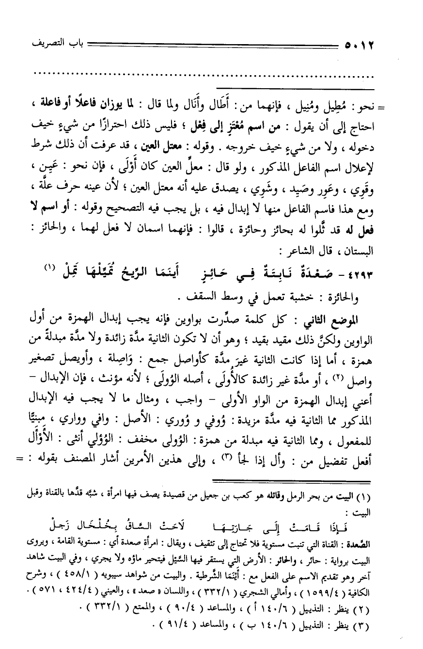 الصّعدة: القناة التي تنبت مستوية فلا تحتاج إلى تثقيف، ويقال: امرأة صعدة أي: مستوية القامة، ويروى البيت برواية: حائر، والحائر: الأرض التي يستقر فيها السّيل فيتحير ماؤه ولا يجري، وفي البيت شاهد آخر وهو تقديم الاسم على الفعل مع: أينما الشّرطية. والبيت من شواهد سيبويه (1/ 458)، وشرح الكافية (4/ 1599)، وأمالي الشجري (1/ 332)، واللسان «صعد»، والعيني (4/ 424، 571).