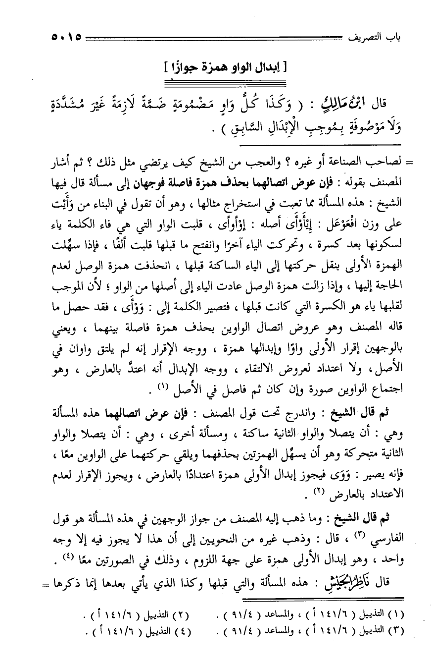 ساكنة، ومسألة أخرى، وهي: أن يتصلا والواو الثانية متحركة وهو أن يسهّل الهمزتين بحذفهما ويلقي حركتهما على الواوين معا، فإنه يصير: ووى فيجوز إبدال الأولى همزة اعتدادا بالعارض، ويجوز الإقرار لعدم الاعتداد بالعارض (¬2).