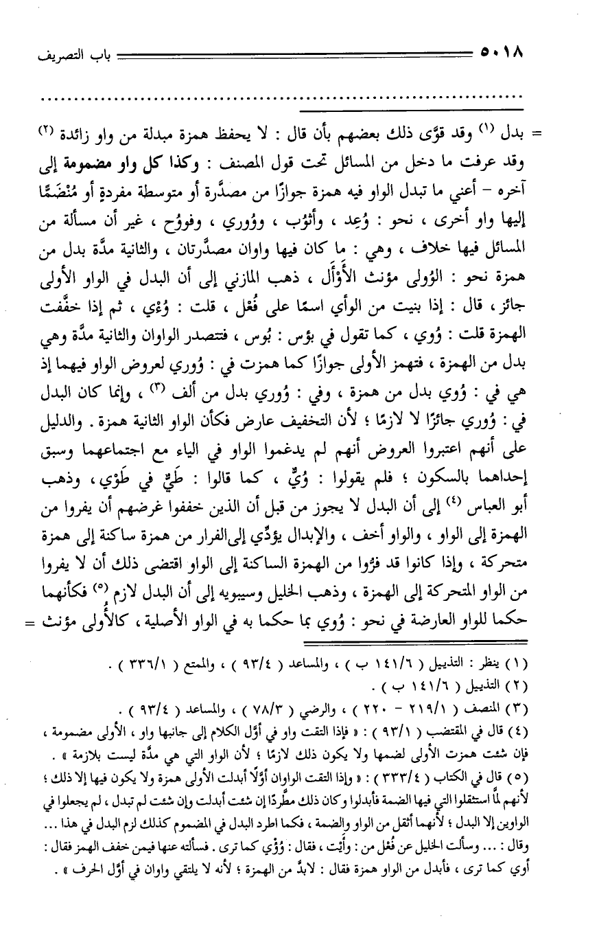 (¬5) قال في الكتاب (4/ 333): «وإذا التقت الواوان أوّلا أبدلت الأولى همزة ولا يكون فيها إلا ذلك؛ لأنهم لمّا استثقلوا التي فيها الضمة فأبدلوا وكان ذلك مطّردا إن شئت أبدلت وإن شئت لم تبدل، لم يجعلوا في الواوين إلا البدل؛ لأنهما أثقل من الواو والضمة، فكما اطرد البدل في المضموم كذلك لزم البدل في هذا ...