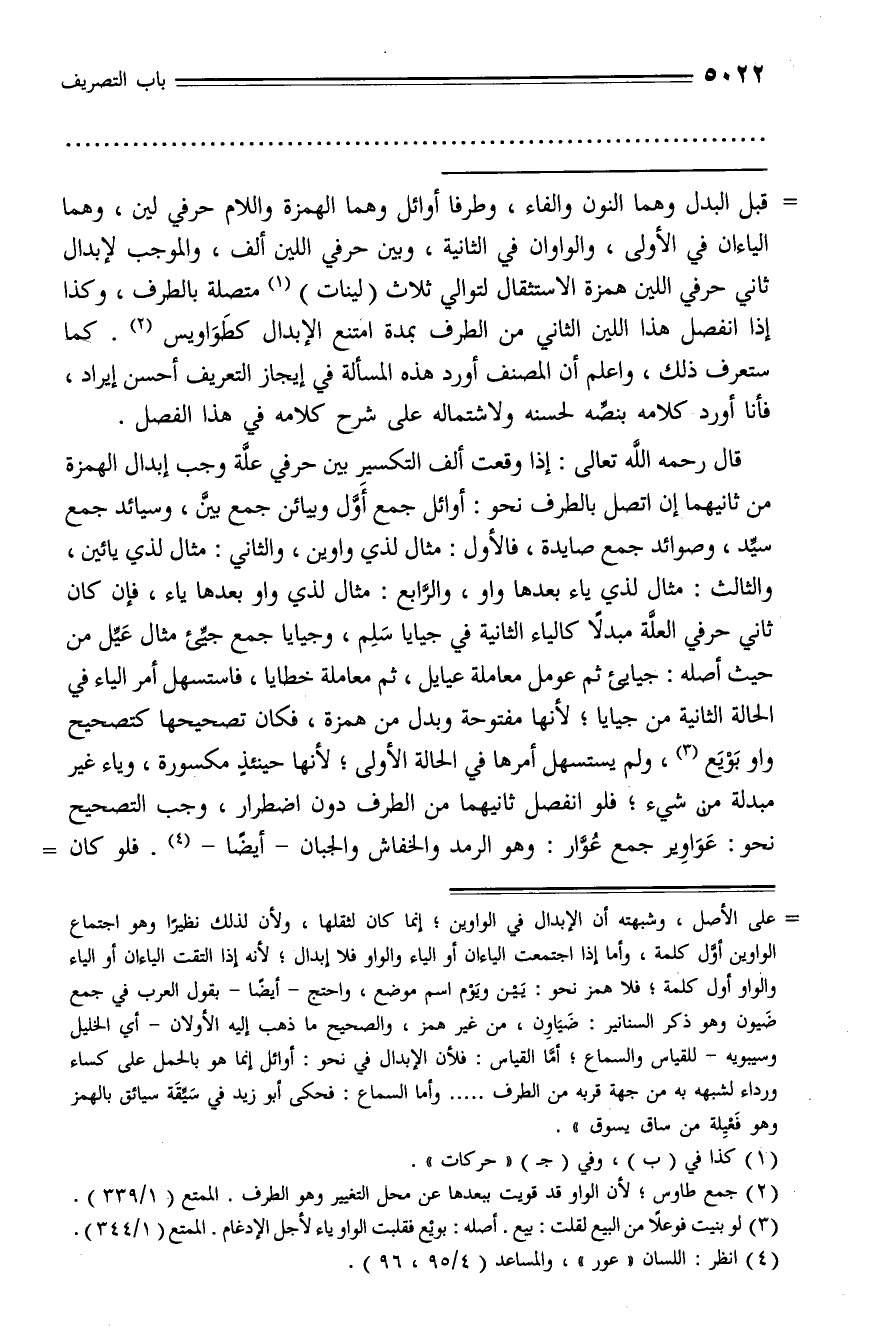 متصلة بالطرف، وكذا إذا انفصل هذا اللين الثاني من الطرف بمدة امتنع الإبدال كطواويس (¬2). كما ستعرف ذلك، واعلم أن المصنف أورد هذه المسألة في إيجاز التعريف أحسن إيراد، فأنا أورد كلامه بنصّه لحسنه ولاشتماله على شرح كلامه في هذا الفصل.