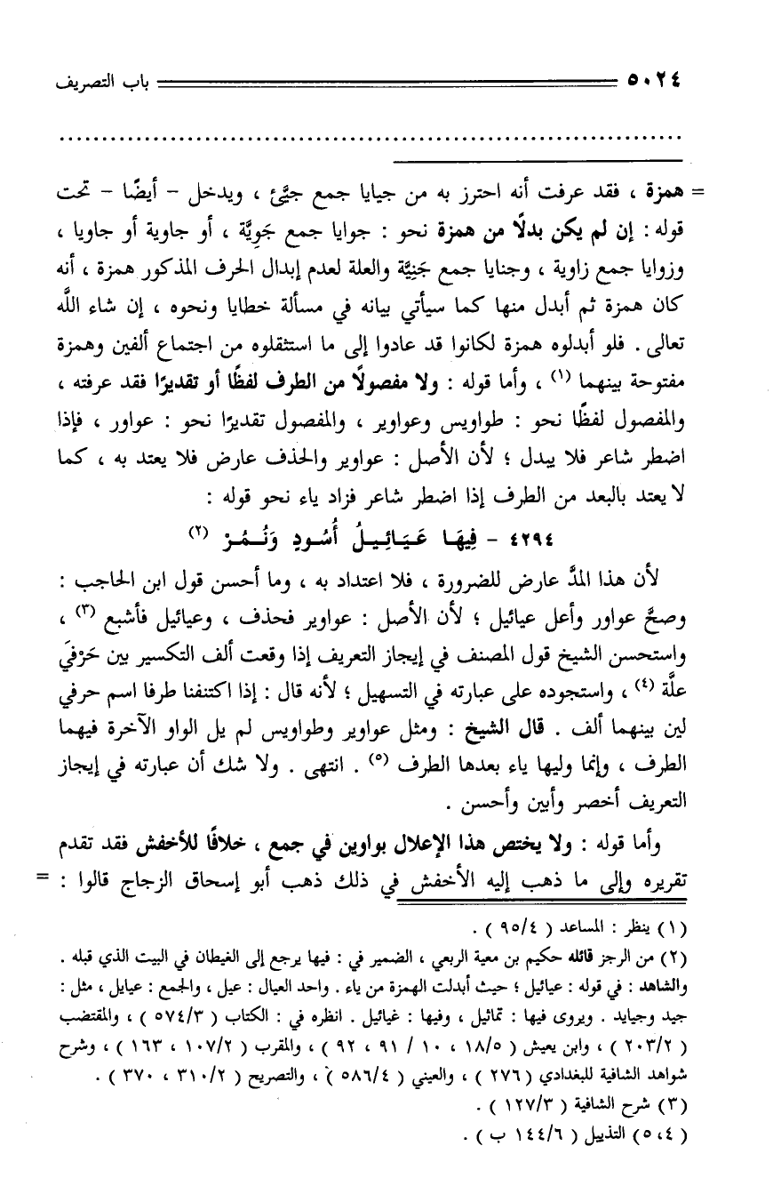 جوايا جمع جويّة، أو جاوية أو جاويا، وزوايا جمع زاوية، وجنايا جمع جنيّة والعلة لعدم إبدال الحرف المذكور همزة، أنه كان همزة ثم أبدل منها كما سيأتي بيانه في مسألة خطايا ونحوه، إن شاء الله تعالى. فلو أبدلوه همزة لكانوا قد عادوا إلى ما استثقلوه من اجتماع ألفين وهمزة مفتوحة بينهما (¬1)، وأما قوله: ولا مفصولا من الطرف لفظا أو تقديرا فقد عرفته، والمفصول لفظا نحو: طواويس وعواوير، والمفصول تقديرا نحو: عواور، فإذا اضطر شاعر فلا يبدل؛ لأن الأصل: عواوير والحذف عارض فلا يعتد به، كما لا يعتد بالبعد من الطرف إذا اضطر شاعر فزاد ياء نحو قوله: