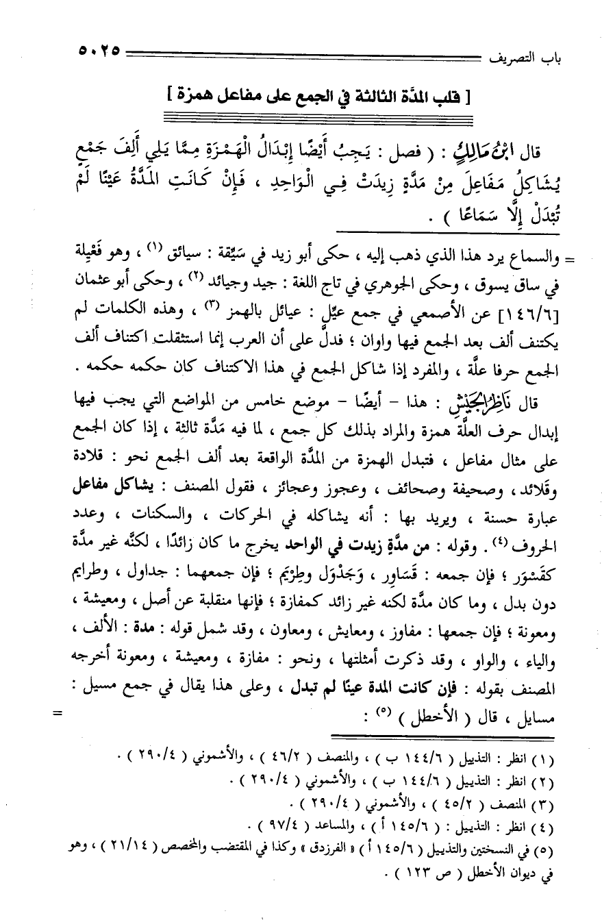 قال ابن مالك: (فصل: يجب أيضا إبدال الهمزة ممّا يلي ألف جمع يشاكل مفاعل من مدّة زيدت في الواحد، فإن كانت