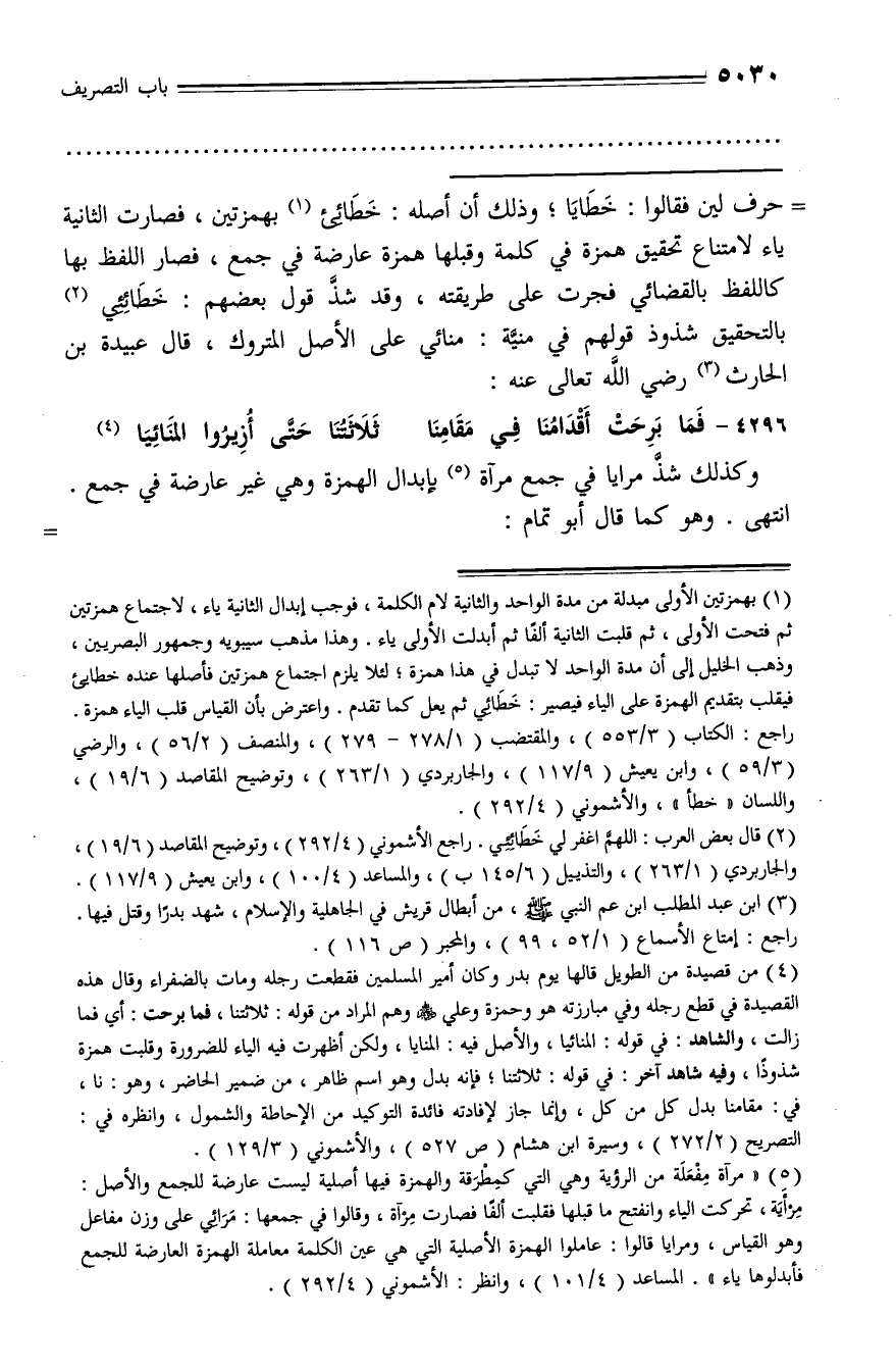 (¬1) بهمزتين الأولى مبدلة من مدة الواحد والثانية لام الكلمة، فوجب إبدال الثانية ياء، لاجتماع همزتين ثم فتحت الأولى، ثم قلبت الثانية ألفا ثم أبدلت الأولى ياء. وهذا مذهب سيبويه وجمهور البصريين، وذهب الخليل إلى أن مدة الواحد لا تبدل في هذا همزة؛ لئلا يلزم اجتماع همزتين فأصلها عنده خطايئ فيقلب بتقديم الهمزة على الياء فيصير: خطائي ثم يعل كما تقدم. واعترض بأن القياس قلب الياء همزة.