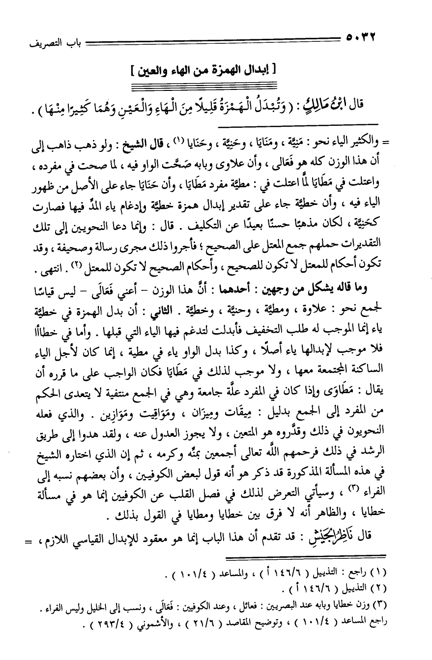 (¬3) وزن خطايا وبابه عند البصريين: فعائل، وعند الكوفيين: فعالى، ونسب إلى الخليل وليس الفراء.