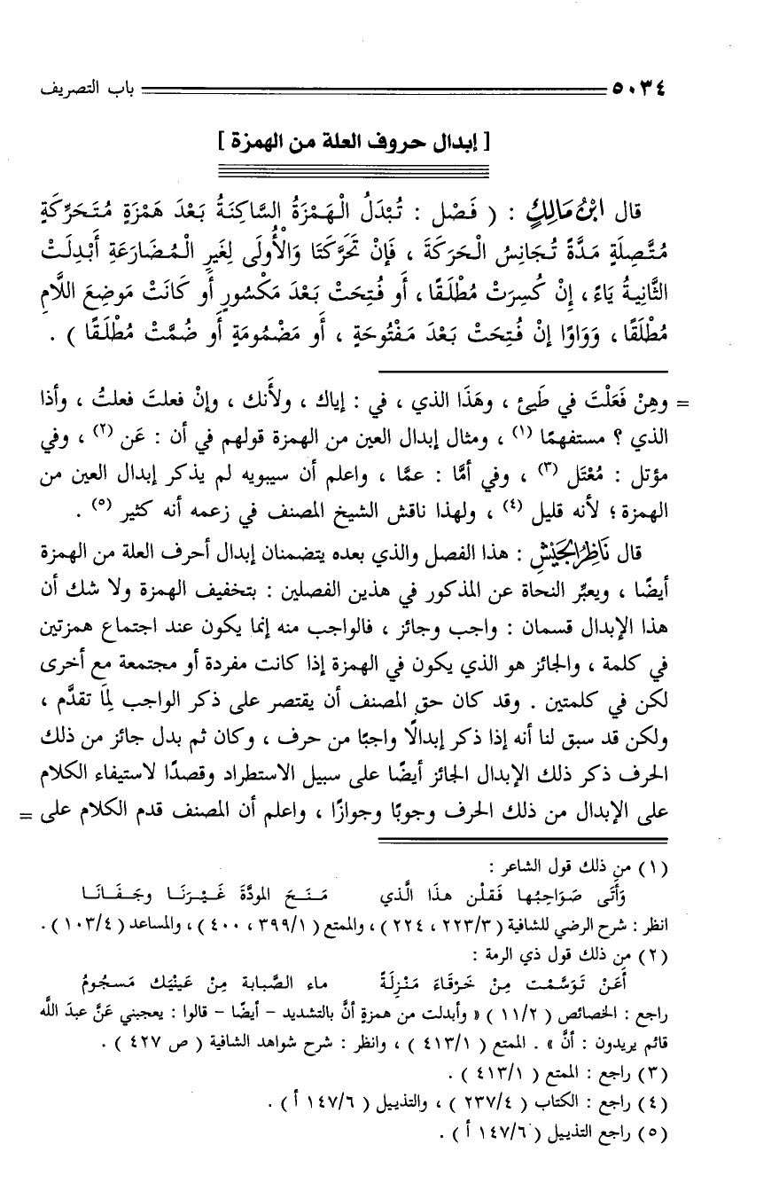 قال ناظر الجيش: هذا الفصل والذي بعده يتضمنان إبدال أحرف العلة من الهمزة أيضا، ويعبّر النحاة عن المذكور في هذين الفصلين: بتخفيف الهمزة ولا شك أن هذا الإبدال قسمان: واجب وجائز، فالواجب منه إنما يكون عند اجتماع همزتين في كلمة، والجائز هو الذي يكون في الهمزة إذا كانت مفردة أو مجتمعة مع أخرى لكن في كلمتين. وقد كان حق المصنف أن يقتصر على ذكر الواجب لما تقدّم، ولكن قد سبق لنا أنه إذا ذكر إبدالا واجبا من حرف، وكان ثم بدل جائز من ذلك الحرف ذكر ذلك الإبدال الجائز أيضا على سبيل الاستطراد وقصدا لاستيفاء الكلام على الإبدال من ذلك الحرف وجوبا وجوازا، واعلم أن المصنف قدم الكلام على -