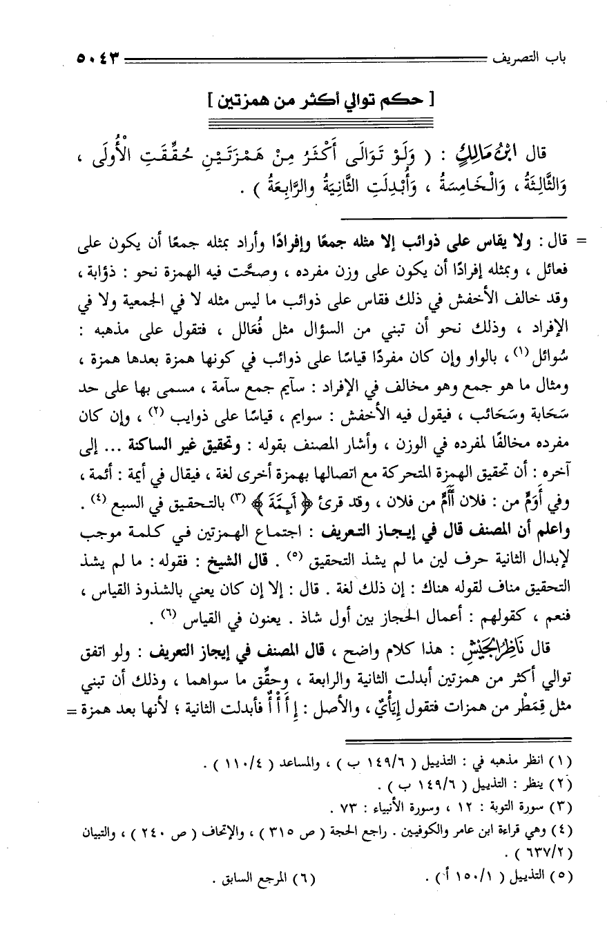 قال ناظر الجيش: هذا كلام واضح، قال المصنف في إيجاز التعريف: ولو اتفق توالي أكثر من همزتين أبدلت الثانية والرابعة، وحقّق ما سواهما، وذلك أن تبني مثل قمطر من همزات فتقول إيأي، والأصل: إ أأ أفأبدلت الثانية؛ لأنها بعد همزة -