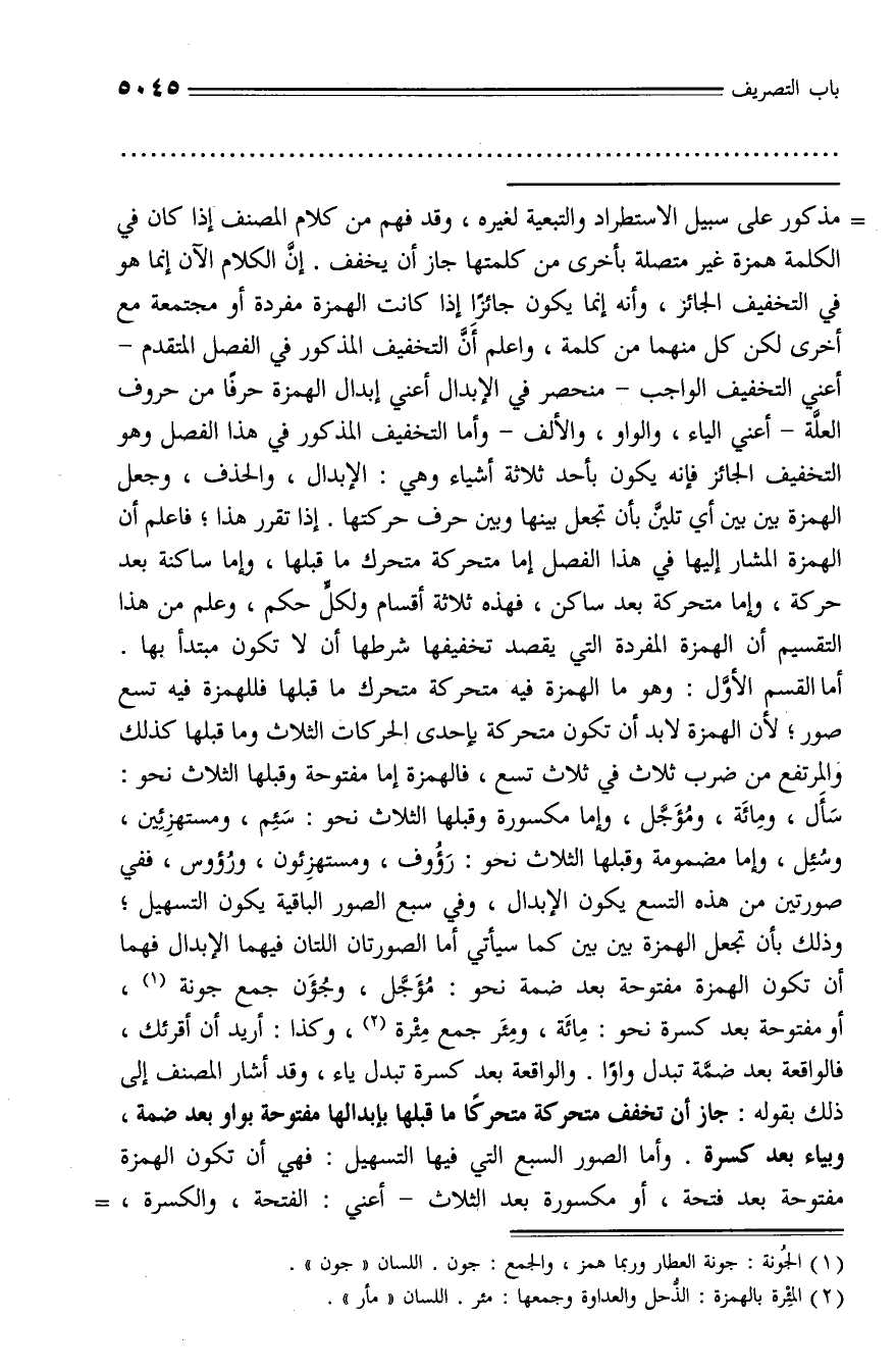 مذكور على سبيل الاستطراد والتبعية لغيره، وقد فهم من كلام المصنف إذا كان في الكلمة همزة غير متصلة بأخرى من كلمتها جاز أن يخفف. إنّ الكلام الآن إنما هو في التخفيف الجائز، وأنه إنما يكون جائزا إذا كانت الهمزة مفردة أو مجتمعة مع أخرى لكن كل منهما من كلمة، واعلم أنّ التخفيف المذكور في الفصل المتقدم - أعني التخفيف الواجب - منحصر في الإبدال أعني إبدال الهمزة حرفا من حروف العلّة - أعني الياء، والواو، والألف - وأما التخفيف المذكور في هذا الفصل وهو التخفيف الجائز فإنه يكون بأحد ثلاثة أشياء وهي: الإبدال، والحذف، وجعل الهمزة بين بين أي تلينّ بأن تجعل بينها وبين حرف حركتها. إذا تقرر هذا؛ فاعلم أن الهمزة المشار إليها في هذا الفصل إما متحركة متحرك ما قبلها، وإما ساكنة بعد حركة، وإما متحركة بعد ساكن، فهذه ثلاثة أقسام ولكلّ حكم، وعلم من هذا التقسيم أن الهمزة المفردة التي يقصد تخفيفها شرطها أن لا تكون مبتدأ بها.