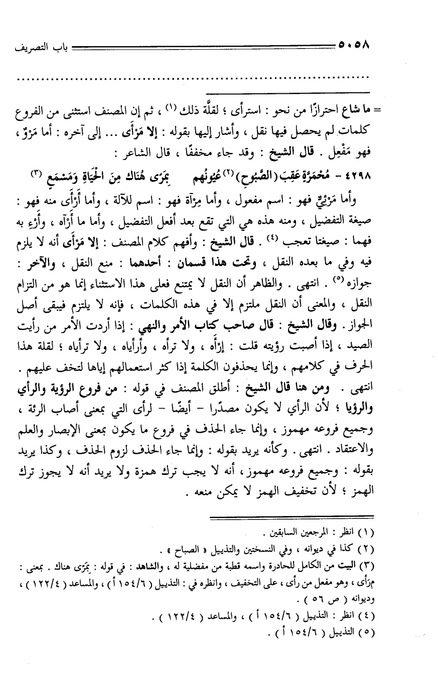 جوازه (¬5). انتهى. والظاهر أن النقل لا يمتنع فعلى هذا الاستثناء إنما هو من التزام النقل، والمعنى أن النقل ملتزم إلا في هذه الكلمات، فإنه لا يلتزم فيبقى أصل الجواز. وقال الشيخ: قال صاحب كتاب الأمر والنهي: إذا أردت الأمر من رأيت الصيد، إذا أصبت رؤيته قلت: إرأه، ولا ترأه، وأرأياه، ولا ترأياه؛ لقلة هذا الحرف في كلامهم، وإنما
