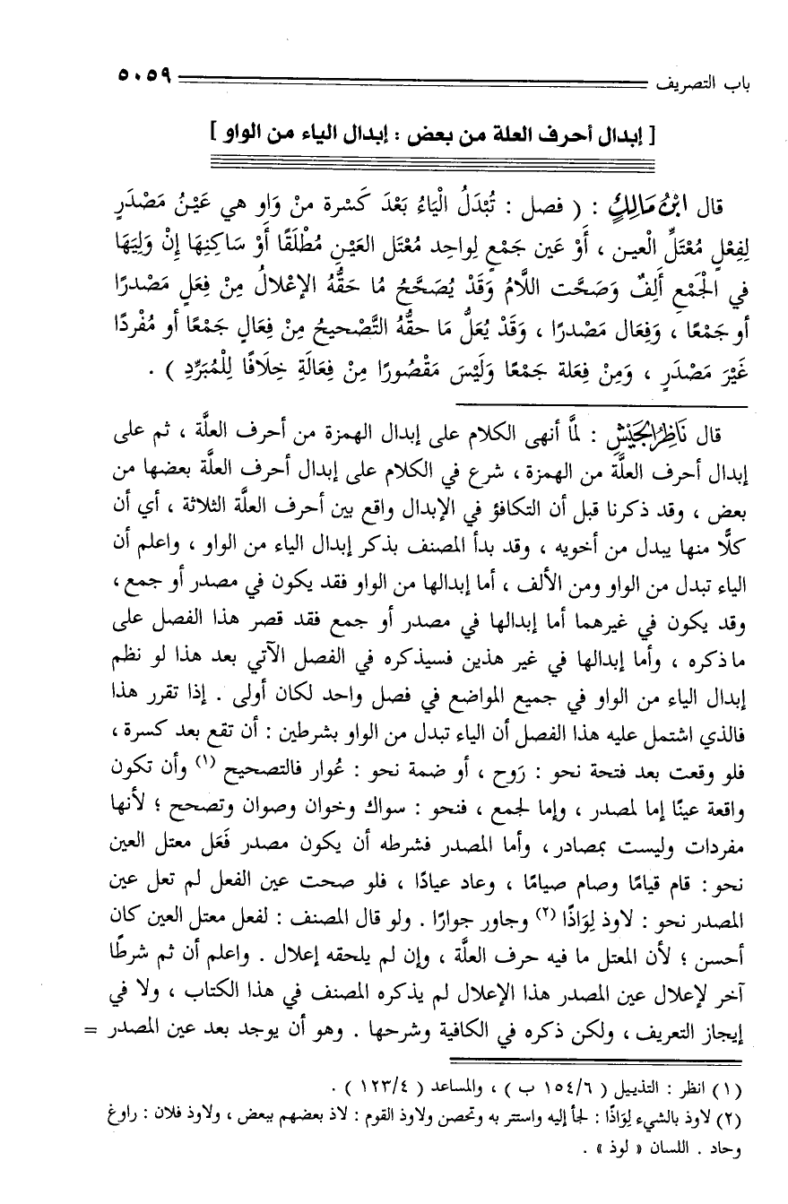 قال ناظر الجيش: لمّا أنهى الكلام على إبدال الهمزة من أحرف العلّة، ثم على إبدال أحرف العلّة من الهمزة، شرع في الكلام على إبدال أحرف العلّة بعضها من بعض، وقد ذكرنا قبل أن التكافؤ في الإبدال واقع بين أحرف العلّة الثلاثة، أي أن كلّا منها يبدل من أخويه، وقد بدأ المصنف بذكر إبدال الياء من الواو، واعلم أن الياء تبدل من الواو ومن الألف، أما إبدالها من الواو فقد يكون في مصدر أو جمع، وقد يكون في غيرهما أما إبدالها في مصدر أو جمع فقد قصر هذا الفصل على ما ذكره، وأما إبدالها في غير هذين فسيذكره في الفصل الآتي بعد هذا لو نظم إبدال الياء من الواو في جميع المواضع في فصل واحد لكان أولى. إذا تقرر هذا فالذي اشتمل عليه هذا الفصل أن الياء تبدل من