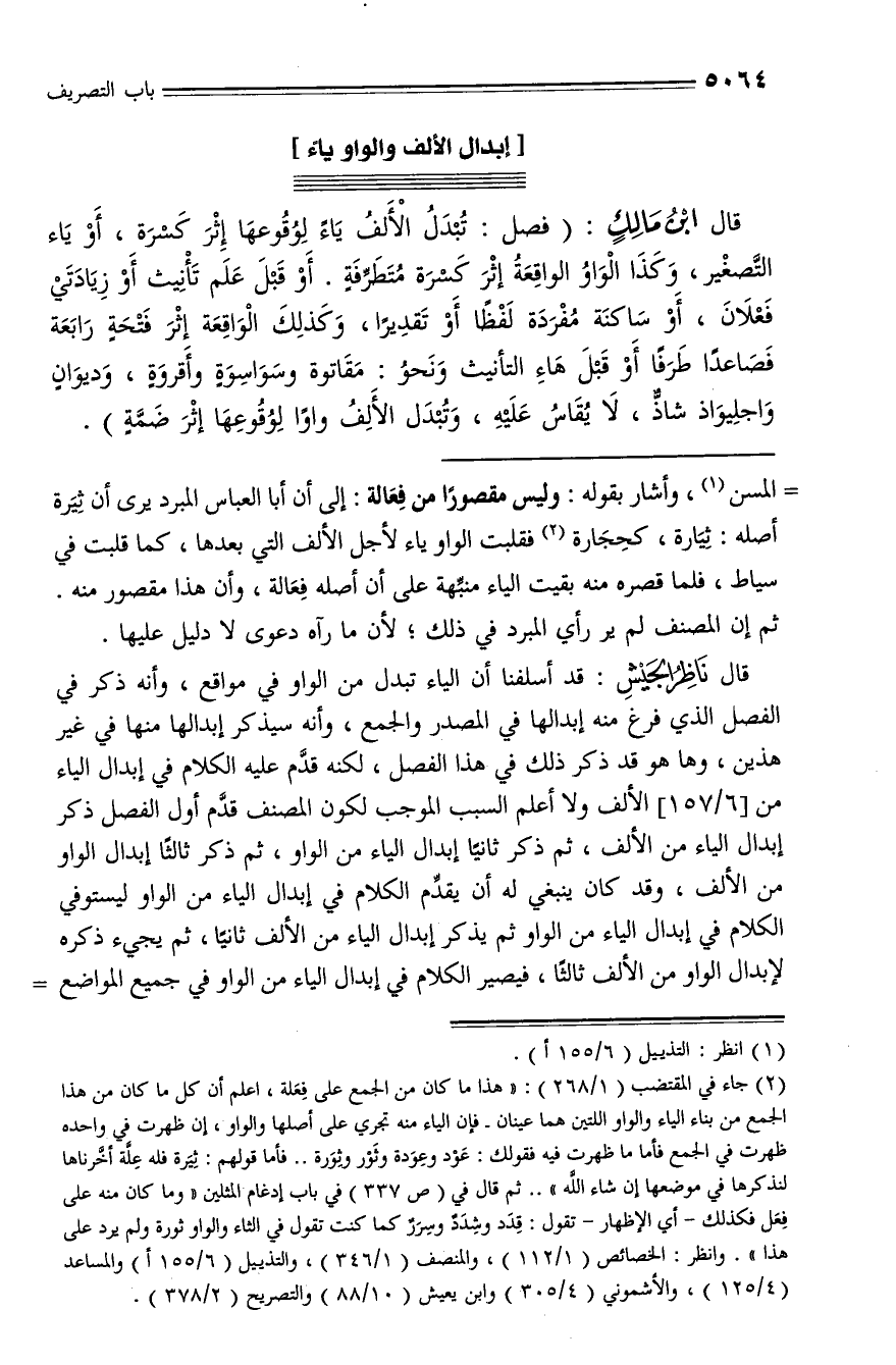 قال ابن مالك: (فصل: تبدل الألف ياء لوقوعها إثر كسرة، أو ياء التّصغير، وكذا الواو الواقعة إثر كسرة متطرّفة. أو قبل علم تأنيث أو زيادتي فعلان، أو ساكنة مفردة لفظا أو تقديرا، وكذلك الواقعة إثر فتحة رابعة فصاعدا طرفا أو قبل هاء التأنيث ونحو: مقاتوة وسواسوة وأقروة، وديوان واجليواذ شاذّ، لا يقاس عليه، وتبدل الألف واوا لوقوعها إثر ضمّة).