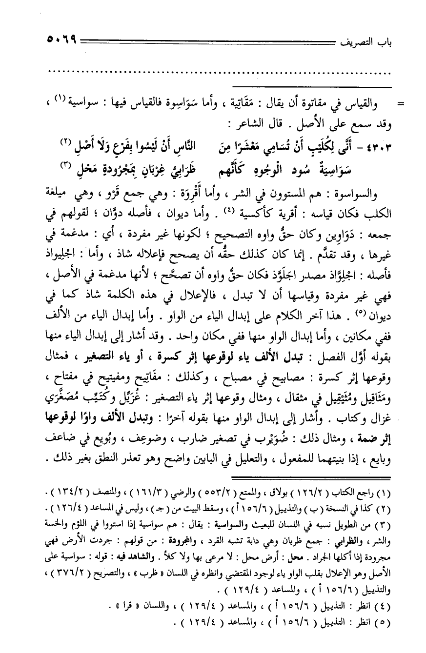 (¬3) من الطويل نسبه في اللسان للبعيث والسواسية: يقال: هم سواسية إذا استووا في اللؤم والخسة والشر، والظرابي: جمع ظربان وهي دابة تشبه القرد، والمجرودة: من قولهم: جردت الأرض فهي مجرودة إذا أكلها الجراد. محل: أرض محل: لا مرعى بها ولا كلأ. والشاهد فيه: قوله: سواسية على الأصل وهو الإعلال بقلب الواو ياء لوجود المقتضي وانظره في اللسان «ظرب»، والتصريح (2/ 376)، والتذييل (6/ 156 أ)، والمساعد (4/ 129).