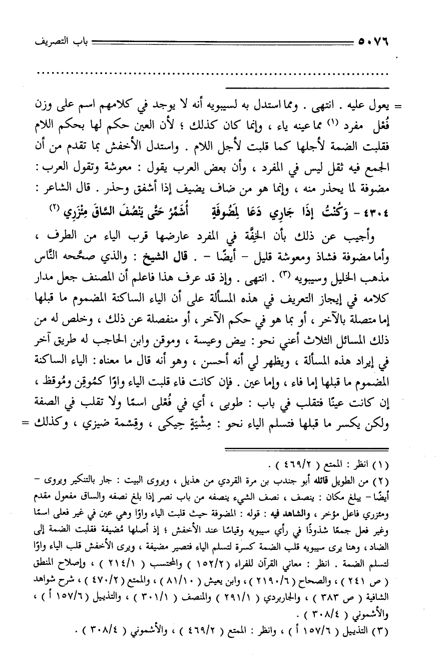 (¬2) من الطويل قائله أبو جندب بن مرة القردي من هذيل، ويروى البيت: جار بالتنكير ويروى - أيضا - يبلغ مكان: ينصف، نصف الشيء ينصفه من باب نصر إذا بلغ نصفه والساق مفعول مقدم ومئزري فاعل مؤخر، والشاهد فيه: قوله: المضوفة حيث قلبت الياء واوا وهي عين في غير فعلى اسما وغير فعل جمعا شذوذا في رأي سيبويه وقياسا عند الأخفش؛ إذ أصلها مضيفة فقلبت الضمة إلى الضاد، وهنا يرى سيبويه قلب الضمة كسرة لتسلم الياء فتصير مضيفة، ويرى الأخفش قلب الياء واوا لتسلم الضمة. انظر: معاني القرآن للفراء (2/ 152) والمحتسب (1/ 214)، وإصلاح المنطق (ص 241)، والصحاح (6/ 2190)، وابن يعيش (10/ 81)، والممتع (2/ 470)، شرح شواهد الشافية (ص 383)، والجاربردي (1/ 291) والمنصف (1/ 301)، والتذييل (6/ 157 أ)، والأشموني (4/ 308).