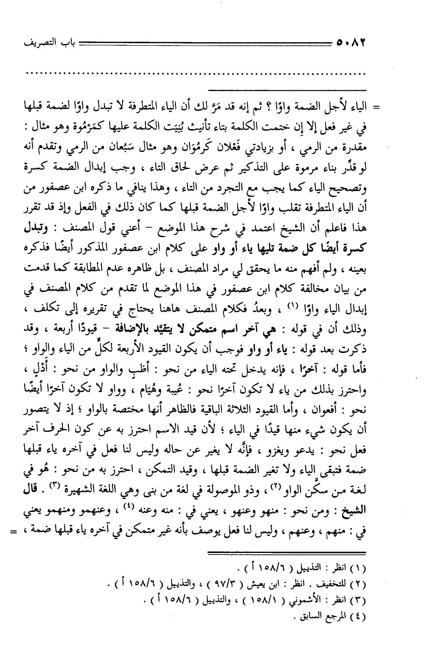 مقدرة من الرمي، أو بزيادتي فعلان كرموان وهو مثال سبعان من الرمي وتقدم أنه لو قدّر بناء مرموة على التذكير ثم عرض لحاق التاء، وجب إبدال الضمة كسرة وتصحيح الياء كما يجب مع التجرد من التاء، وهذا ينافي ما ذكره ابن عصفور من أن الياء المتطرفة تقلب واوا لأجل الضمة قبلها كما كان ذلك في الفعل وإذ قد تقرر هذا فاعلم أن الشيخ اعتمد في شرح هذا الموضع - أعني قول المصنف: وتبدل كسرة أيضا كل ضمة تليها ياء أو واو على كلام ابن عصفور المذكور أيضا فذكره بعينه، ولم أفهم منه ما يحقق لي مراد المصنف، بل ظاهره عدم المطابقة كما قدمت من بيان مخالفة كلام ابن عصفور في هذا الموضع لما تقدم من كلام المصنف في إبدال الياء واوا (¬1)، وبعد فكلام المصنف هاهنا يحتاج في تقريره إلى تكلف، وذلك أن في قوله: هي آخر اسم متمكن لا يتقيّد بالإضافة - قيودا أربعة، وقد ذكرت بعد قوله: ياء أو واو فوجب أن يكون القيود الأربعة لكلّ من الياء والواو؛ فأما قوله: آخرا، فإنه يدخل تحته الياء من نحو: أظب والواو من نحو: أدل، واحترز بذلك من ياء لا تكون آخرا نحو: عيبة وهيام، وواو لا تكون آخرا أيضا نحو: أفعوان، وأما القيود الثلاثة الباقية فالظاهر أنها مختصة بالواو؛ إذ لا يتصور أن يكون شيء منها قيدا في الياء؛ لأن قيد الاسم احترز به عن كون الحرف آخر فعل نحو: يدعو ويغزو، فإنّه لا يغير عن حاله وليس لنا فعل في آخره ياء قبلها ضمة فتبقى الياء ولا تغير الضمة قبلها، وقيد التمكن، احترز به من نحو: هو في لغة من سكّن الواو (¬2)، وذو الموصولة في لغة من بنى وهي اللغة الشهيرة (¬3). قال الشيخ: ومن نحو: منهو وعنهو، يعني في: منه وعنه (¬4)، وعنهمو ومنهمو يعني في: منهم، وعنهم، وليس لنا فعل يوصف بأنه غير متمكن في آخره ياء قبلها ضمة، -