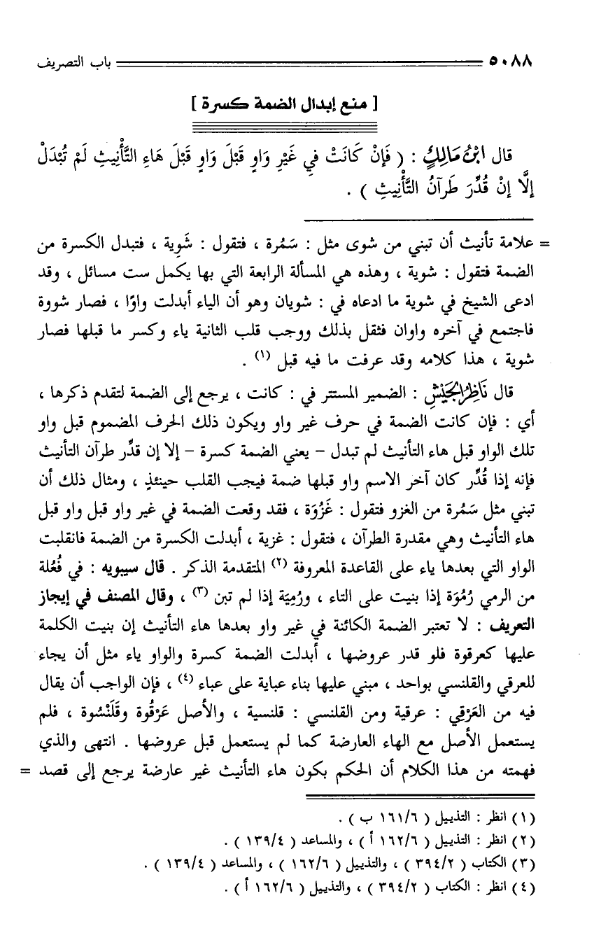 قال ناظر الجيش: الضمير المستتر في: كانت، يرجع إلى الضمة لتقدم ذكرها، أي: فإن كانت الضمة في حرف غير واو ويكون ذلك الحرف المضموم قبل واو تلك الواو قبل هاء التأنيث لم تبدل - يعني الضمة كسرة - إلا إن قدّر طرآن التأنيث فإنه إذا قدّر كان آخر الاسم واو قبلها ضمة فيجب القلب حينئذ، ومثال ذلك أن تبني مثل سمرة من الغزو فتقول: غزوة، فقد وقعت الضمة في غير واو قبل واو قبل هاء التأنيث وهي مقدرة الطرآن، فتقول: غزية، أبدلت الكسرة من الضمة فانقلبت الواو التي بعدها ياء على القاعدة المعروفة (¬2) المتقدمة الذكر. قال سيبويه: في فعلة من الرمي رموة إذا بنيت على التاء، ورمية إذا لم تبن (¬3)، وقال المصنف في إيجاز التعريف: لا تعتبر الضمة الكائنة في غير واو بعدها هاء التأنيث إن بنيت الكلمة عليها كعرقوة فلو قدر عروضها، أبدلت الضمة كسرة والواو ياء مثل أن يجاء للعرقي والقلنسي بواحد، مبني عليها بناء عباية على عباء (¬4)، فإن الواجب أن يقال فيه من العرقي: عرقية ومن القلنسي: قلنسية، والأصل عرقوة وقلنسوة، فلم يستعمل الأصل مع الهاء العارضة كما لم يستعمل قبل عروضها. انتهى والذي فهمته من هذا الكلام أن الحكم بكون هاء التأنيث غير عارضة يرجع إلى قصد -