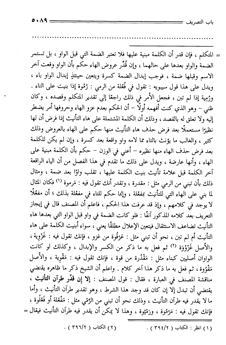المتكلم، فإن قدر أن الكلمة مبنية عليها فلا تعتبر الضمة التي قبل الواو، بل تستمر الضمة والواو بعدها على حالهما، وإن قدّر عروض الهاء حكم بأن الواو وقعت آخر الاسم وقبلها ضمة، فوجب إبدال الضمة كسرة ويتعين حينئذ إبدال الواو ياء، ويدل على هذا قول سيبويه: تقول في فعلة من الرمي: رموة إذا بنيت على التاء.